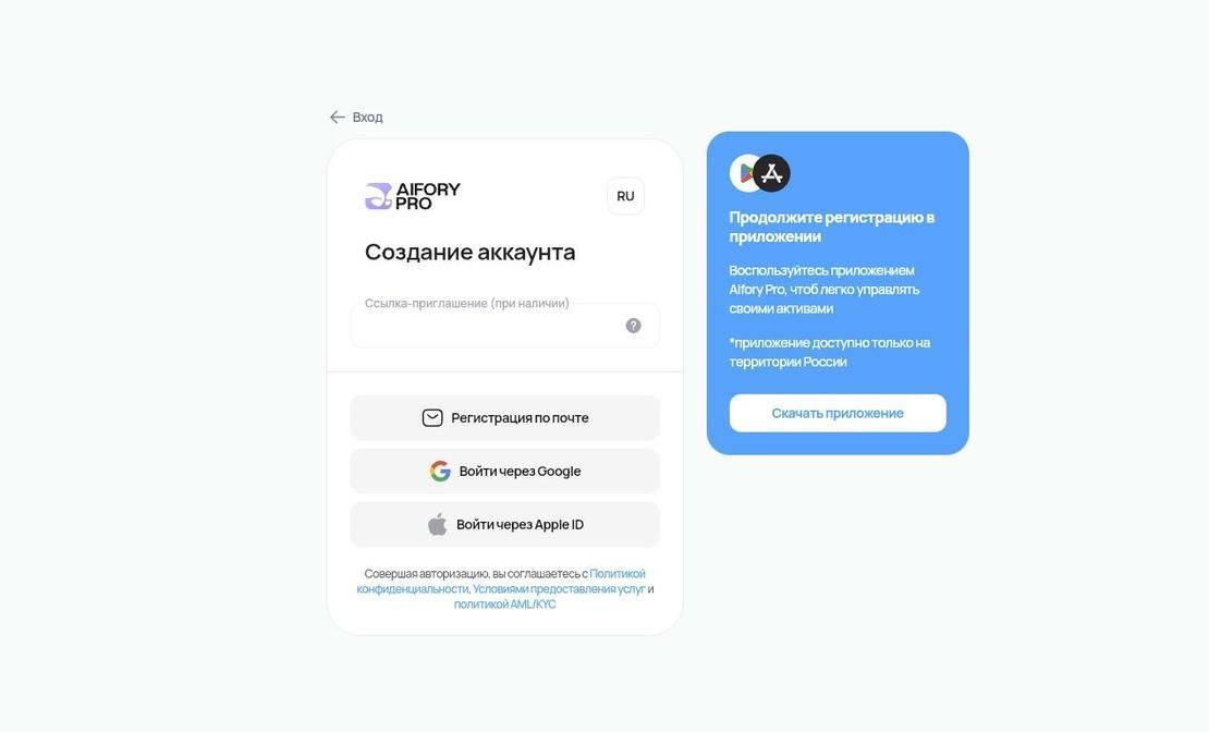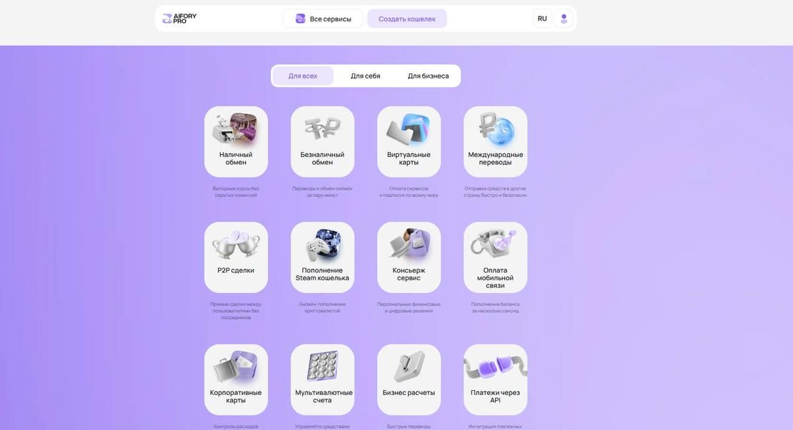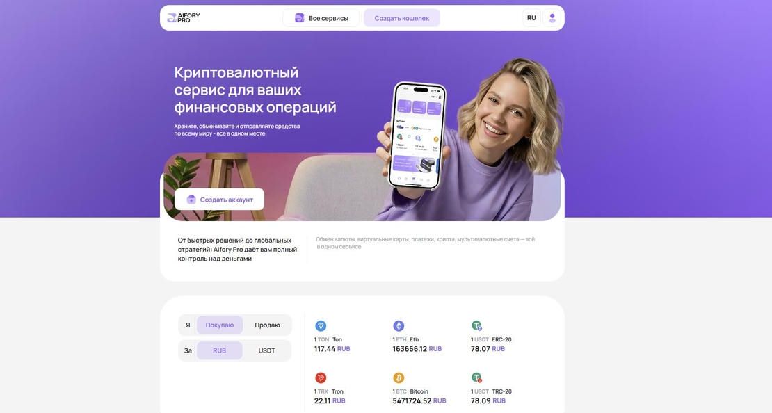 تجمع Aifory Pro منتجين ضمن منظومة واحدة: خدمة لتبادل العملات الرقمية ومحفظة هاتفية لتخزين الأصول. تعمل الخدمة في السوق الروسي منذ عدة سنوات وتبني عملياتها حول الصفقات الآمنة: شراء وبيع العملات الرقمية، السحب بالروبل، العمليات الحضورية، والمتابعة عبر التطبيق.