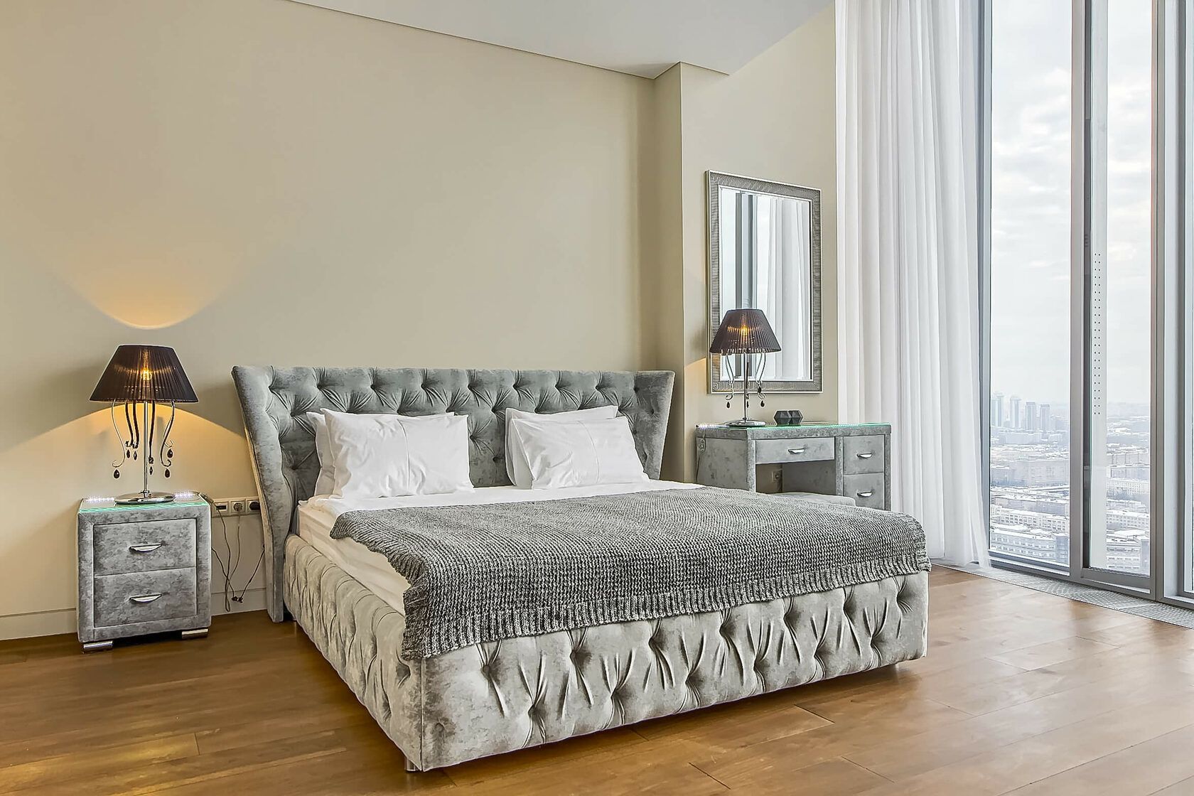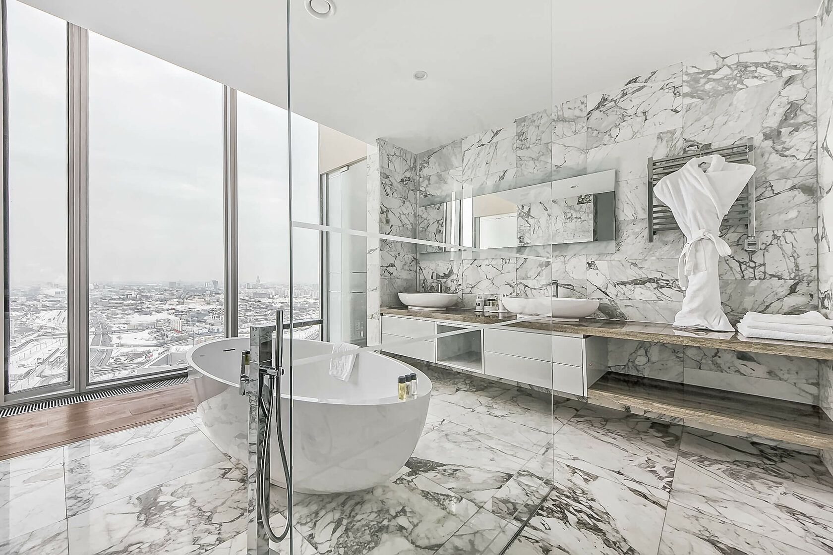 تقع شقة "سكاي جراند لاونج" الفاخرة، بمساحة 160 مترًا مربعًا، في الطابق 45 من برج أوكو الشهير. تُطل نوافذها على مناظر خلابة لحديقة النصر وشمال غرب موسكو. تتميز الشقة بمساحة داخلية واسعة، بأسقف بارتفاع خمسة أمتار، وتضم حمامًا مزودًا بحوض استحمام بجوار نافذة بانورامية، ومسرحًا منزليًا مزودًا بإضاءة Ambilight ونظام صوت Harman Cardon. كما تضم الشقة وسائل راحة فندقية أساسية ومجموعة متنوعة من أدوات المائدة لتلبية احتياجات ما يصل إلى ثمانية أشخاص.