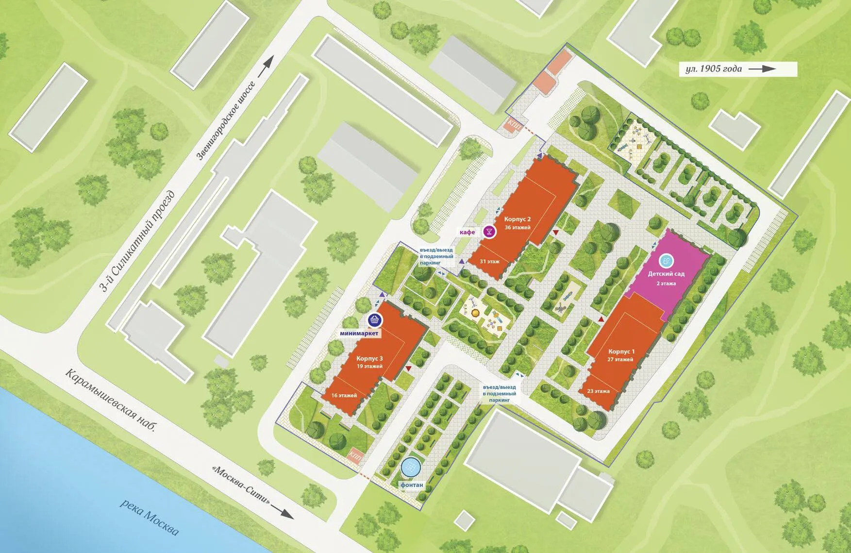 تم تصميم التخطيط الشامل والبنية التحتية للمجمع لتوفير السكن للسكان ليس فقط ولكن أيضًا مكانًا كاملاً للعيش فيه، بالقرب من العمل والمؤسسات التعليمية ومراكز الترفيه.