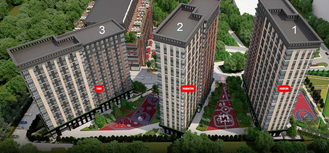 حديقة مُصممة. يتوسط المجمع مساحة خضراء تبلغ مساحتها حوالي هكتارين، تضم مسارات، ومدرجًا، ونافورة، ومناطق جلوس. يتميز تصميم الحديقة بتنسيقها الخاص، ومقاعدها، وإضاءة زخرفية.