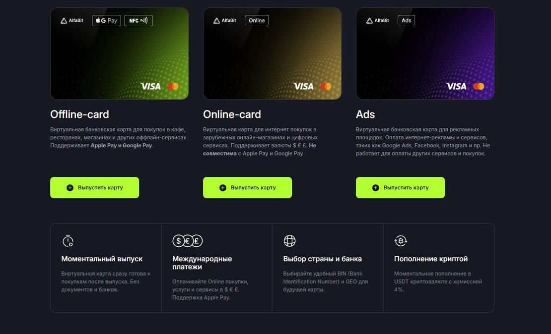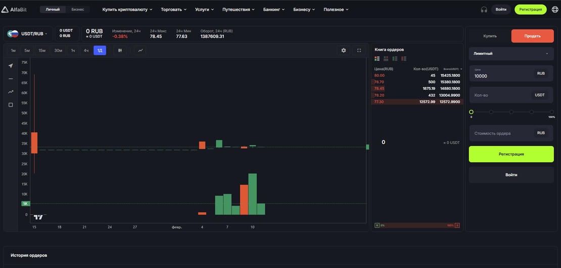 AlfaBit — многофункциональная криптоплатформа с фокусом на спотовую торговлю и широкую линейку сопутствующих сервисов. В основе — биржевая инфраструктура с 659 торговыми парами и ордерами, дополненная быстрыми сценариями: конвертацией внутри аккаунта, покупкой криптовалюты за рубли с российских карт, Telegram MiniApp для сделок в мессенджере, платёжным шлюзом для бизнеса и возможностью оплачивать авиабилеты криптовалютой. По заявленным данным, проект работает с 2018 года, поддерживает 653 криптовалюты и обеспечивает поддержку 24/7, а торговые комиссии указаны в диапазоне 0–0,2%.