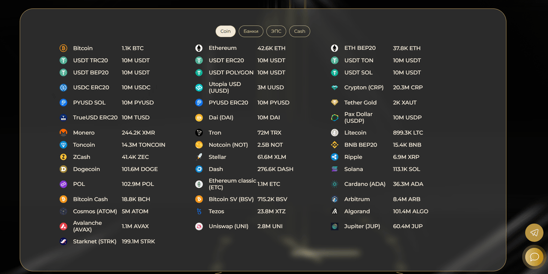 Сервис поддерживает широкий набор направлений ввода и вывода. В части криптовалют и платёжных систем доступны, в том числе, Bitcoin, Ethereum, Tron, Ripple, Monero, Litecoin, Dogecoin, Dash, Zcash, Bitcoin Cash, Ethereum Classic, а также стейблкоины Tether USDT (ERC-20 и TRC-20), USDC и TUSD. Кроме криптовалютных переводов, предусмотрены операции через электронные платёжные системы, включая Perfect Money, Capitalist, Payeer и AdvCash, а также другие направления, доступные в интерфейсе сервиса.