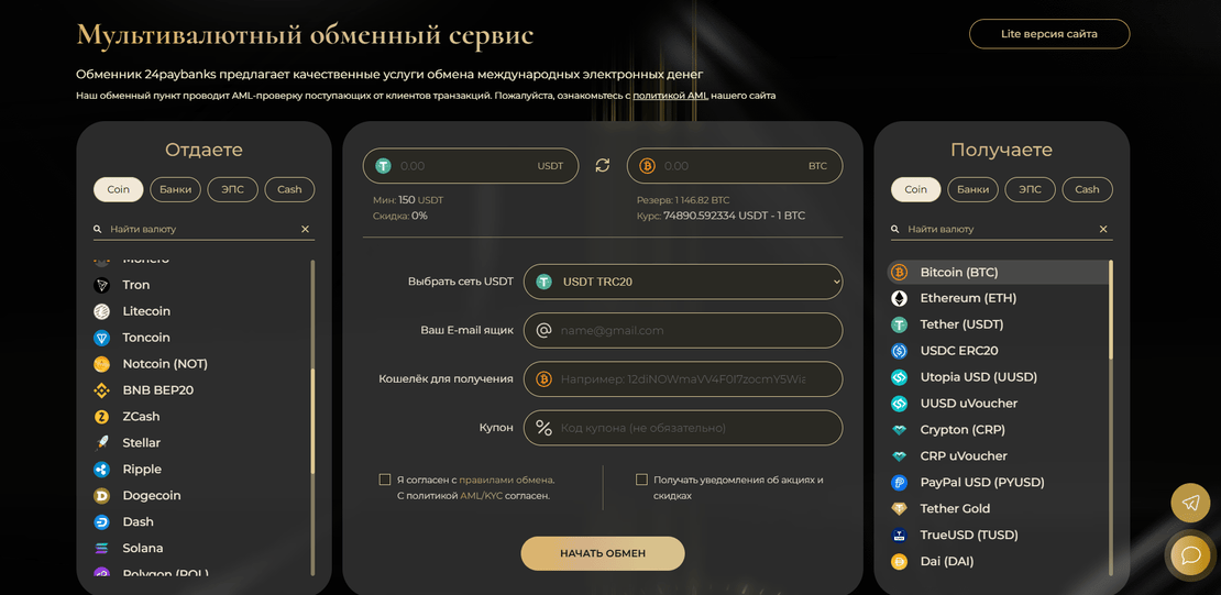 24PayBank — сервис для обмена криптовалют и электронных денег, рассчитанный на практичное использование: быстрые заявки, понятная логика обработки и широкий выбор направлений ввода и вывода. В обменных операциях обычно важны не обещания, а управляемость процесса: корректные реквизиты в заявке, прозрачные условия по курсу и комиссии, лимиты и резерв по направлению, а также возможность оперативно получить помощь в момент, когда она действительно нужна. Криптообменник 24PayBank подходит для повседневных обменов, когда требуется провести операцию без лишних шагов и с контролем статуса.