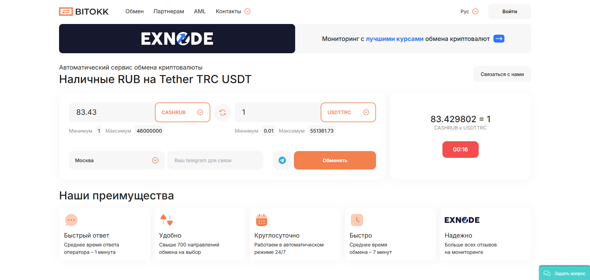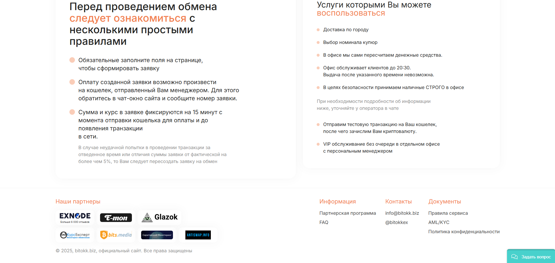 Менеджеры отвечают в Telegram, WhatsApp и по телефону круглосуточно. Это позволяет крупным клиентам заранее обсудить детали, зарезервировать крупную партию USDT или BTC и приехать ровно к назначенному времени.