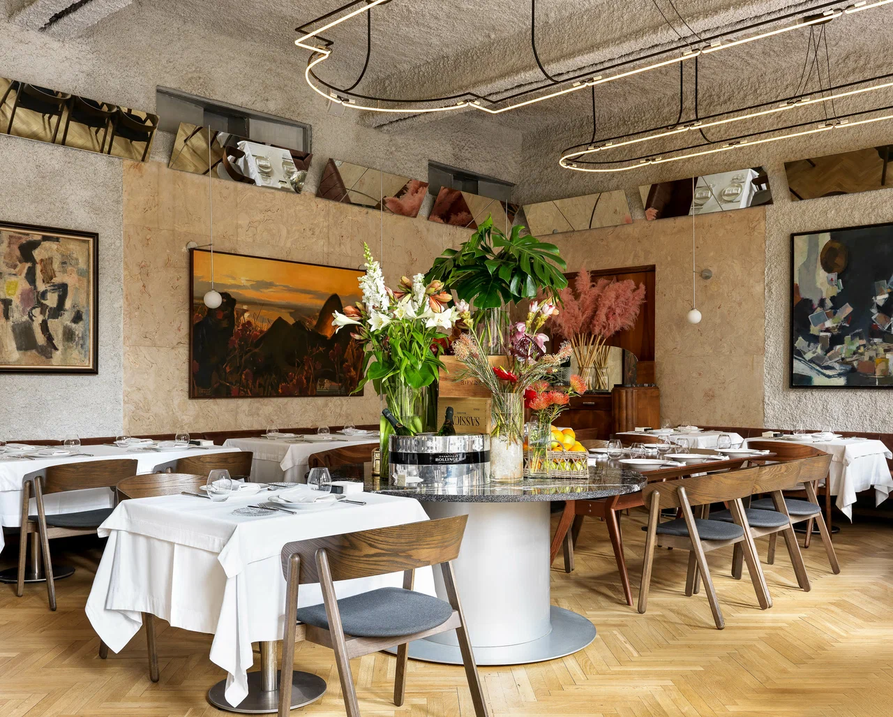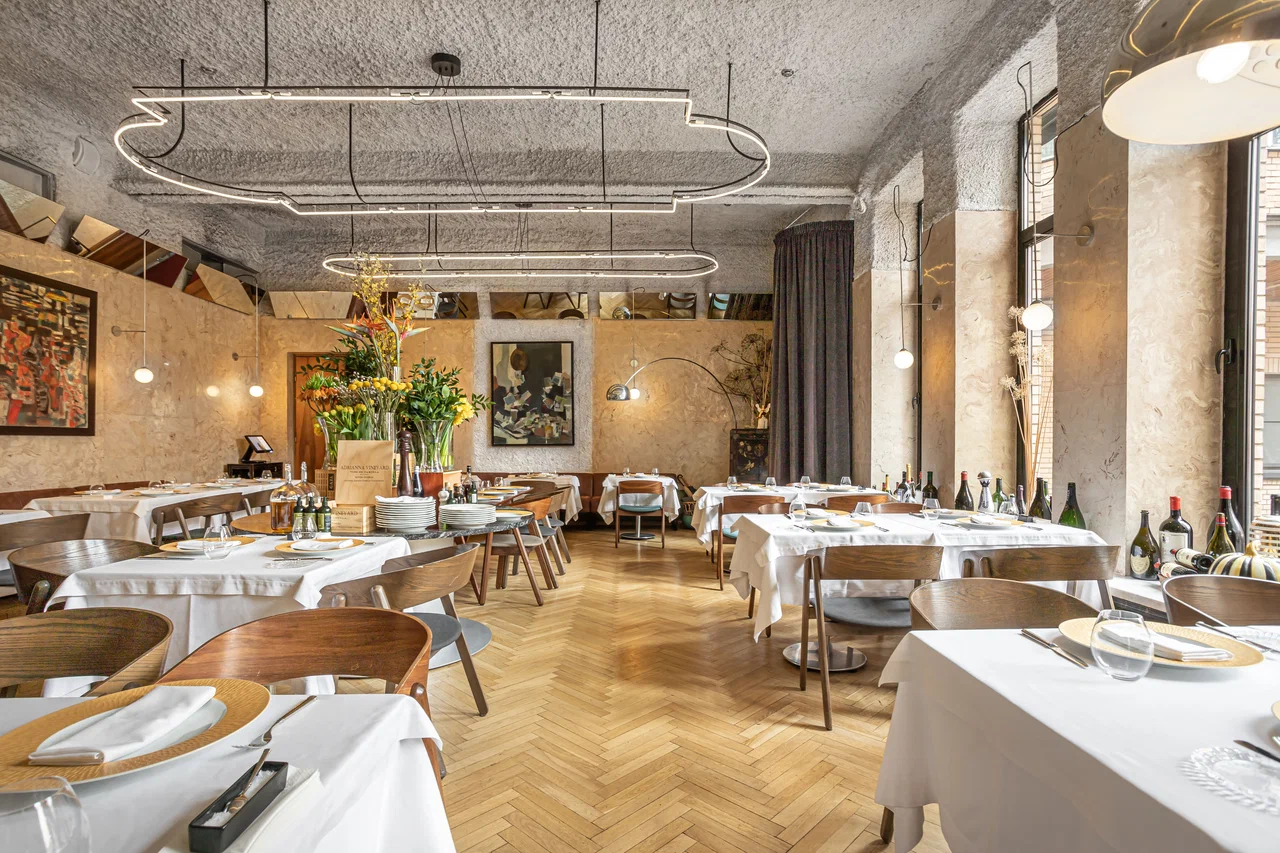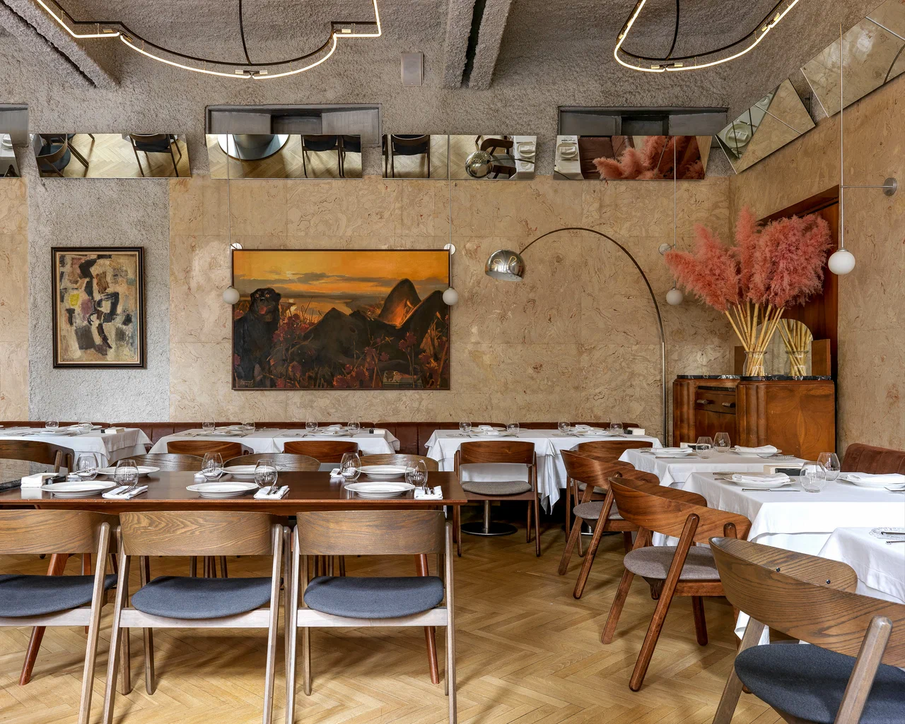 There are two dining rooms inside, with a calm atmosphere. The interior references 1960s–70s aesthetics, featuring marble, mirrors, and soft lighting.