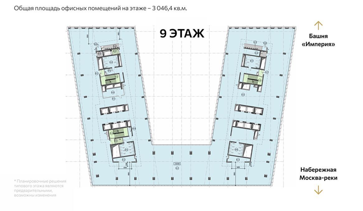 A 3,046.4 sq m office space on the 9th floor of the new "Imperia 2" complex in the heart of the Moscow-City international business cluster is now available for sale. This format is ideal for investors considering purchasing a highly liquid asset with the option of subsequently dividing and selling or leasing individual units. This is a rare opportunity to purchase an office in the Imperia 2 tower during the construction phase and shape the structure of an income-generating asset to suit their strategy.