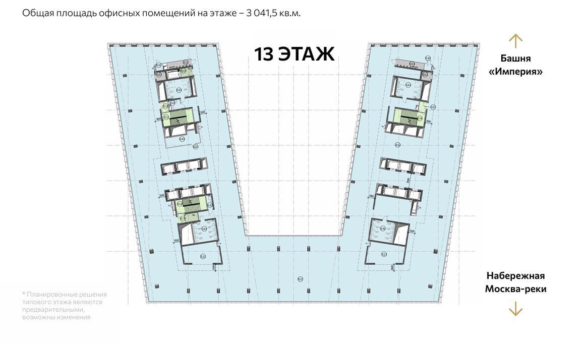 The 13th floor of the new "Empire 2" complex offers 3,041.5 square meters of office space—a format that combines generous floor space, a modern architectural design, and the flexibility to adapt to investor needs. The property is located in one of the most dynamic areas of Moscow City, where demand for modern offices consistently creates favorable conditions for long-term investment.