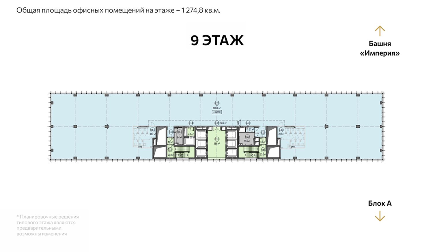 Формат: продажа офиса целым этажом, возможность деления на несколько блоков