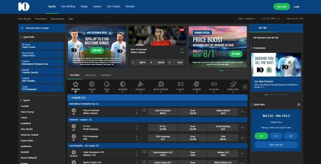 10Bet is an international bookmaker operating since 2003. Following a 2016 rebranding, the bookmaker refocused on the UK market, and its current operations are regulated by a Curacao license. The bookmaker emphasizes practicality: the website features a discreet gray color scheme, without overloading graphics. The top menu includes "Sports," "Live," "Live Casino," "Casino," BetGames.TV, and the Ten Club loyalty club. Next to it are quick links to bonuses, results, and help. On the left is a list of current matches and sports, and below is the pre-match lineup, broken down by discipline.