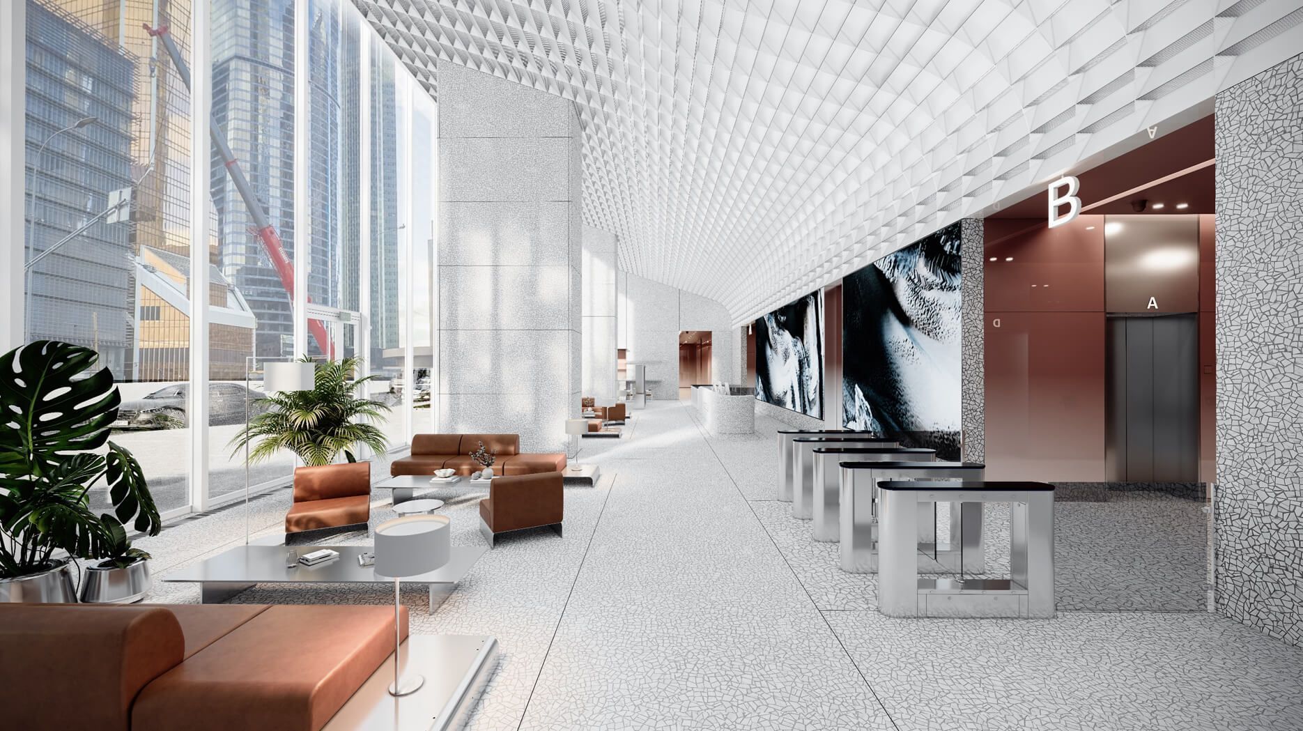 Entrance areas and lobbies deserve special attention. ONE Tower has spacious double-height lobbies in both the office and residential areas . Two-story stained-glass windows in the main entrance area fill the halls with natural light. An interesting detail: the lobbies do not directly open onto the closed space of the parking lot, as is often the case, but look onto the open gallery of the stylobate with landscape design, which makes guests feel as if they are outside. This solution increases prestige and comfort: upon entering the tower, visitors immediately feel the grandeur of the space and the level of service.