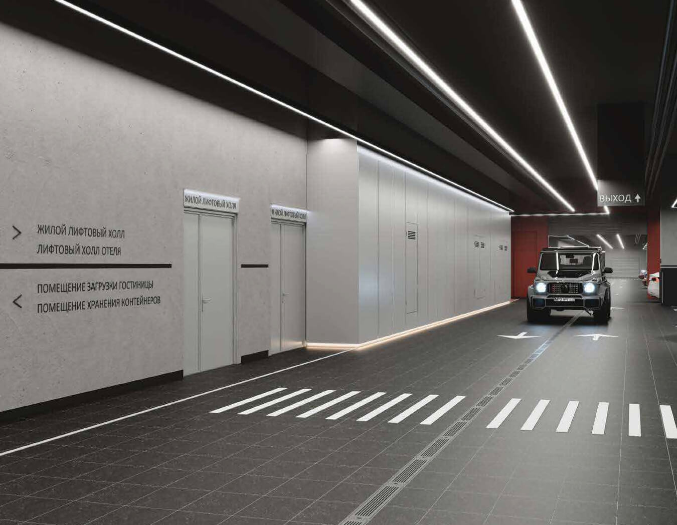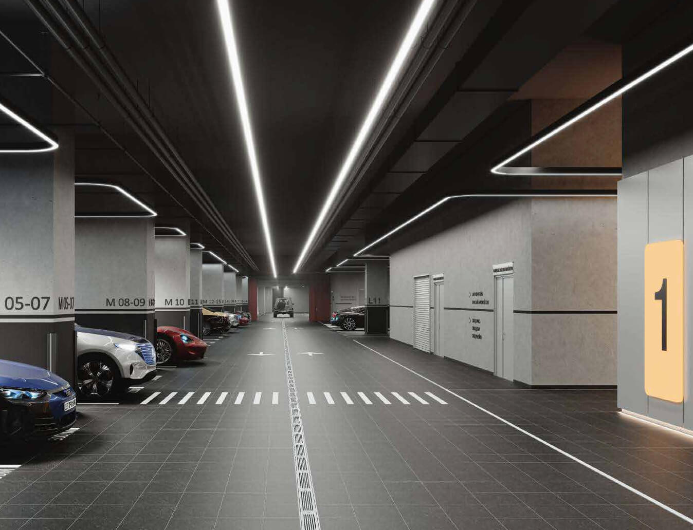 Parking and transport: for motorists, the stylobate part will have a three-level underground parking for ~179 cars. The parking is designed with increased dimensions of the entrance groups and wide ramps for easy maneuvering. Especially for electric cars, high-power fast charging stations will be equipped - you can recharge your car in just ~20 minutes. Cellular signal amplifiers will be installed at all levels of the parking lot so that communication and the Internet work stably even underground. The location of the complex provides excellent transport accessibility: just a couple of minutes' walk to the Delovoy Tsentr metro station (directly to Moscow City), 5 minutes by car to Kutuzovsky Prospekt and the Third Transport Ring, about 7 minutes to the Garden Ring and the historical center. Thus, residents will be able to quickly get to any point in the city, using both personal transport and developed public transport.