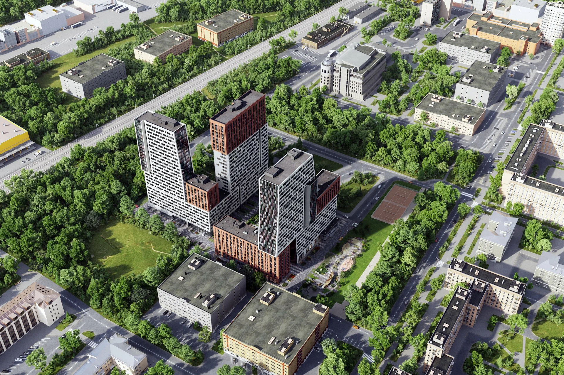 The area where the complex is located historically combines residential and industrial development, but is currently undergoing rapid transformation. "Richard" is built on the site of the former industrial zone No. 9a, "Sorge Street," which is part of the "Big City" revitalization program. The nearby infrastructure does indeed retain its past—the railway tracks run 200 meters away, and the buildings of Thermal Power Plant No. 16 are visible beyond them. However, the immediate surroundings of the complex have already become a comfortable urban neighborhood: Berezovaya Roshcha Park, the VEB Arena Central Stadium, the Megasport Sports Palace, and other recreational and leisure facilities are nearby. Schools, several kindergartens, a library, clinics, a multifunctional center, and shops are all within walking distance. Residents of "Richard" will therefore live in a neighborhood with a rich infrastructure, where everything they need—from education to entertainment—is within easy reach. The environmental situation within the city limits is also favorable: the proximity of green areas (Khodynskoye Pole Park, Birch Grove) helps neutralize the impact of transport and former industrial facilities.
