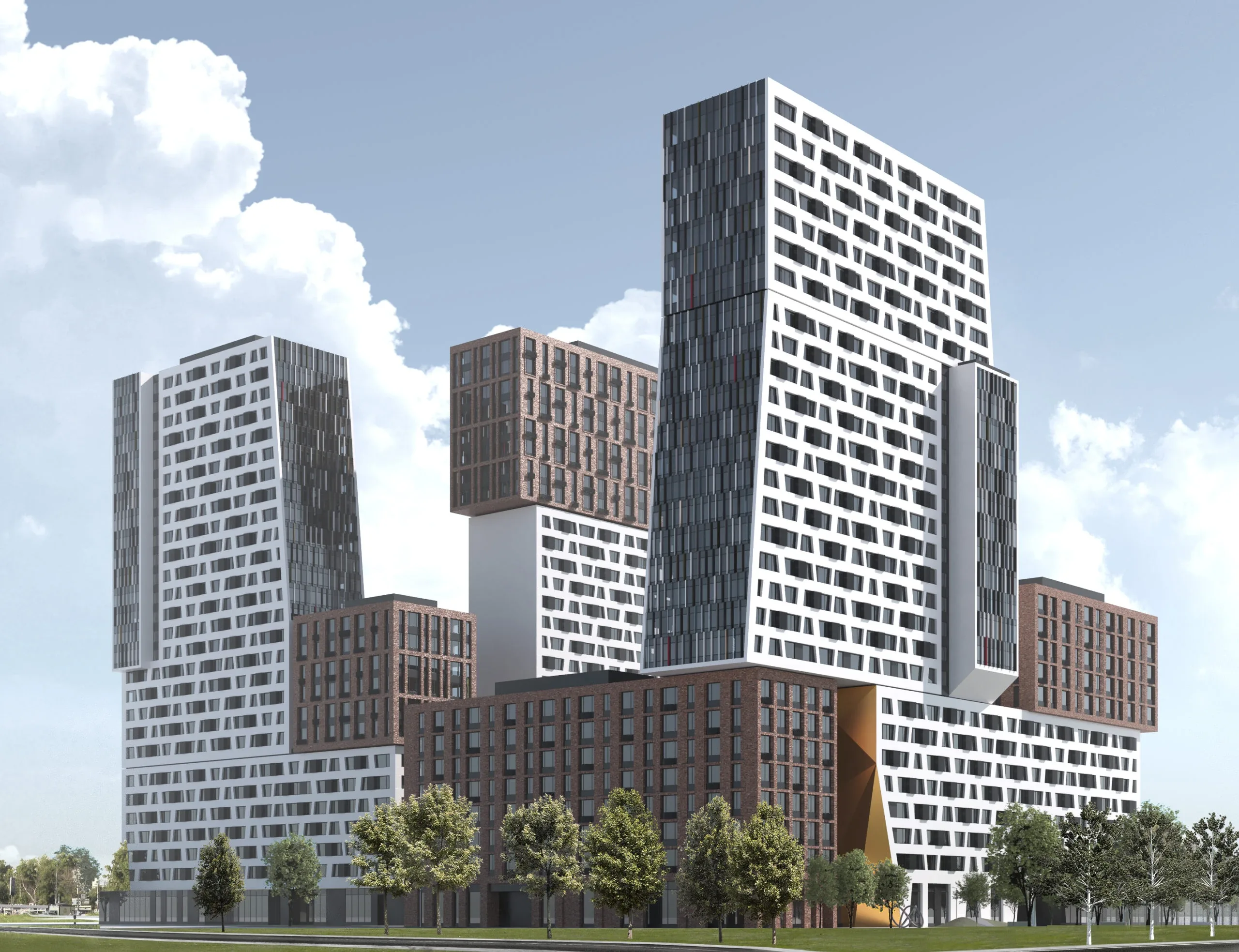 "Richard" consists of two monolithic buildings of varying heights (7–27 stories), custom-designed by the Atrium architectural firm. The buildings' exteriors capture attention with their blend of modern forms and classic materials. The warm-toned brick façades contrast with the glazed surfaces, creating a distinctive silhouette. The architect's signature architectural style is evident in the unconventional solutions: the buildings feature a stepped shape, jagged façade lines, and multi-level sections, adding dynamism and volume to the exterior. A special highlight is the striking golden arched portal at the central entrance—the complex's signature feature. This element, along with a large art installation in the courtyard, underscores the premium status of the new building. The exterior color scheme is refined, harmonizing with the surrounding historic buildings, while panoramic windows on the upper floors enhance the complex's contemporary character.