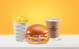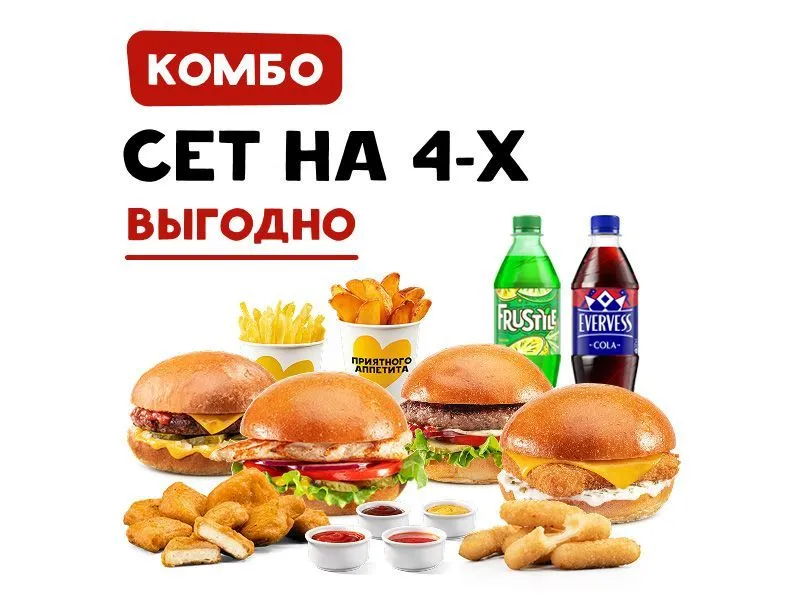 Гарниры и закуски поддерживают основную линейку: картофель фри и по-деревенски, луковые кольца, куриные стрипсы, сырные палочки; к ним — несколько соусов на выбор. В напитках — газированная классика, лимонады, вода, чай и кофе; в десертах — молочные коктейли, мороженое и порционные сладости. Для удобства есть комбо-наборы на одного и на компанию, а также детский сет.
