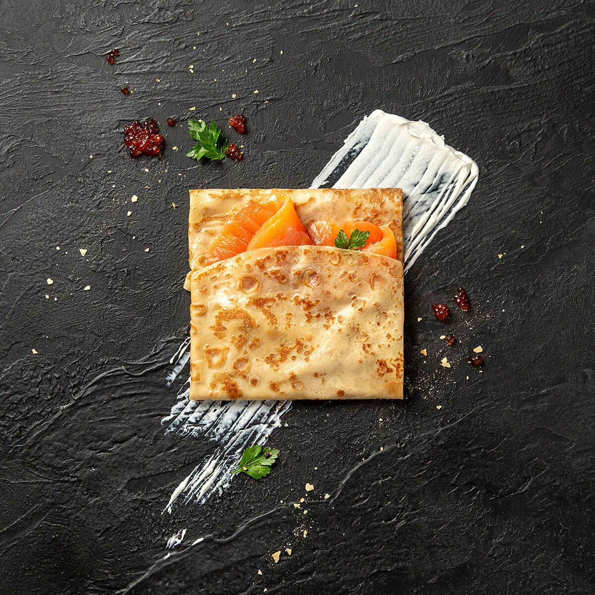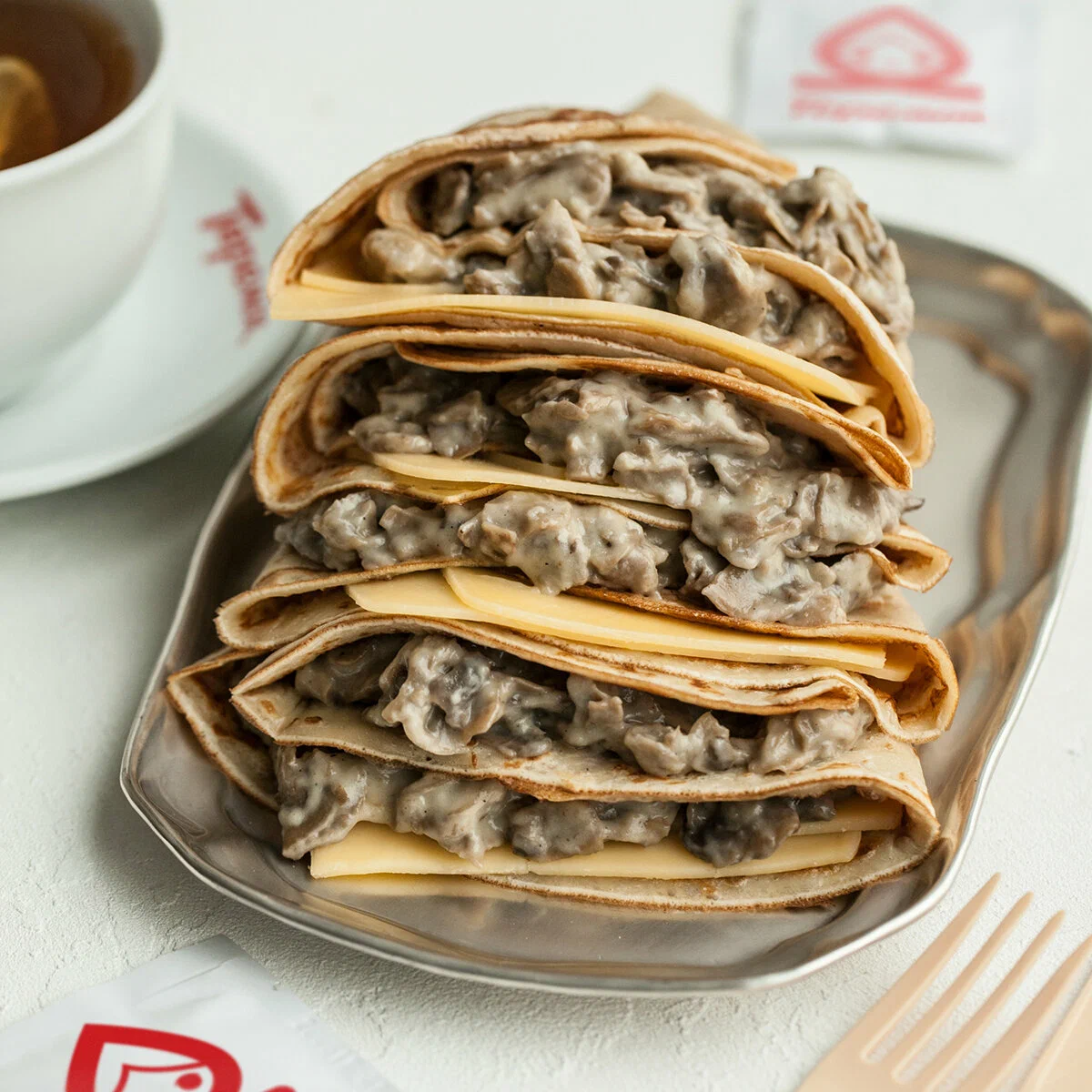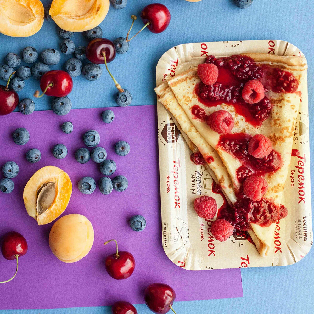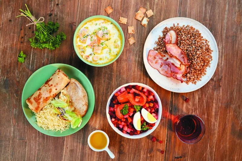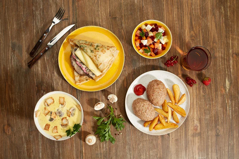 Основу ассортимента составляют блины с классическими и фирменными начинками: от сметаны и варенья до ветчины с сыром, курицы, семги и красной икры. В горячих блюдах — гречка и рис с мясными или овощными добавками, котлеты и гарниры. В супах — борщ, куриный с лапшой, рассольник или щи (сезонно), есть лёгкие овощные позиции. К завтракам относятся каши и сырники; в десертах — блин со сгущённым молоком, творогом, ягодами, медом. Напитки представлены морсом, квасом, компотом, чаем и кофе; регулярно появляются сезонные лимонады и согревающие напитки. Меню сбалансировано по размерам порций и ценовым категориям, предусмотрены детские варианты и сочетания «блин + напиток».