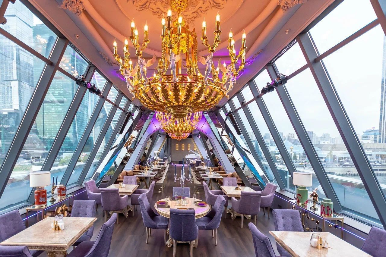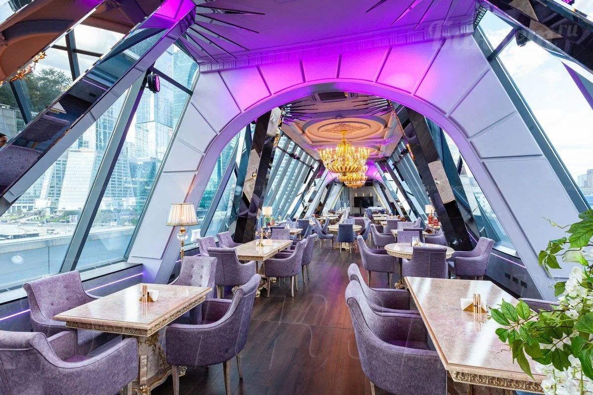 Ресторан гордо устроился на мосту Багратион, возвышаясь над течением Москвы-реки. В его интерьере чувствуется смешение роскошной эстетики, элементов ар-деко и атмосферы сюрреалистического праздника. Неоновое свечение, шикарные перья, декоративная лепнина и капризные узоры вносят особое настроение. Панорамные стекла предоставляют потрясающий вид на реку и могучие башни комплекса Москва-Сити.