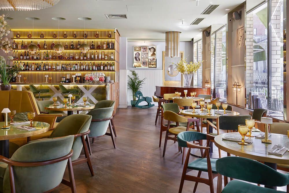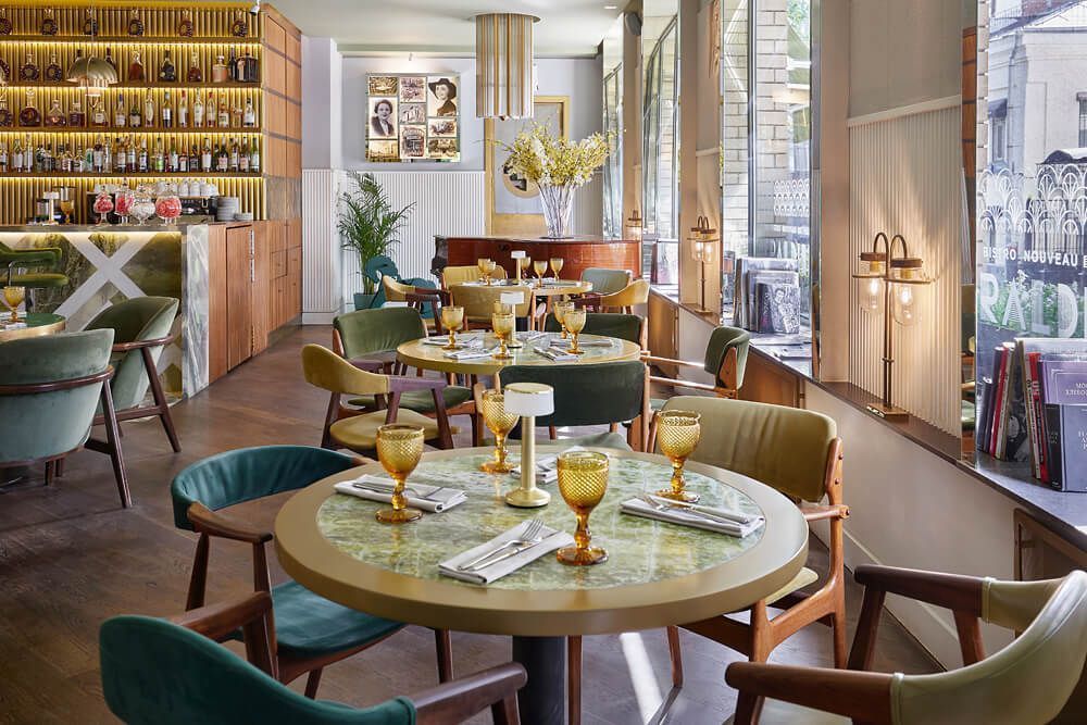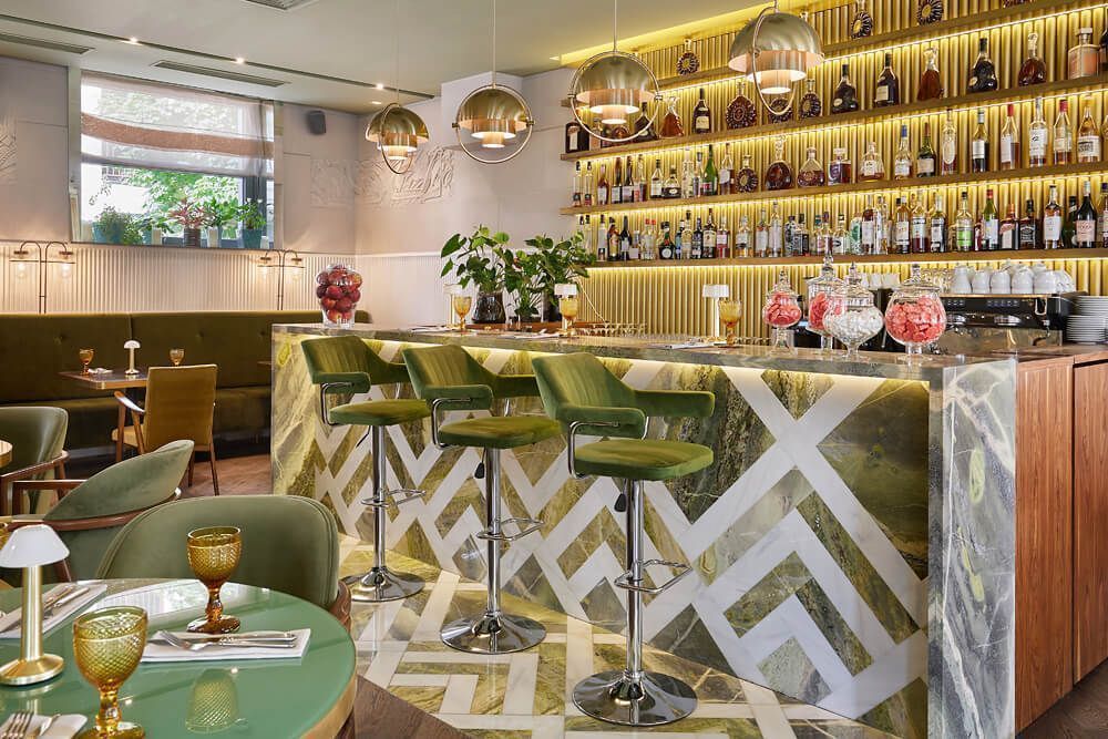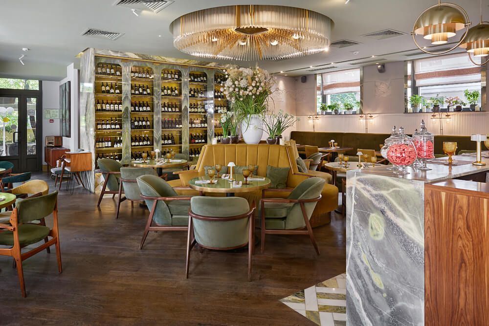Пространство «Жеральдин» оформлено с акцентом на атмосферу французских бистро середины прошлого века. Интерьер отсылает к эстетике конца 50-х — начала 60-х годов с элементами арт-деко, где каждая деталь продумана и работает на общее восприятие. Архитектурная концепция сочетает классические материалы и винтажные элементы, создавая ощущение «парижского уюта» без избыточной стилизации.