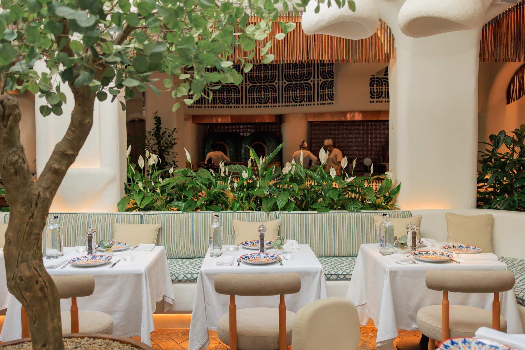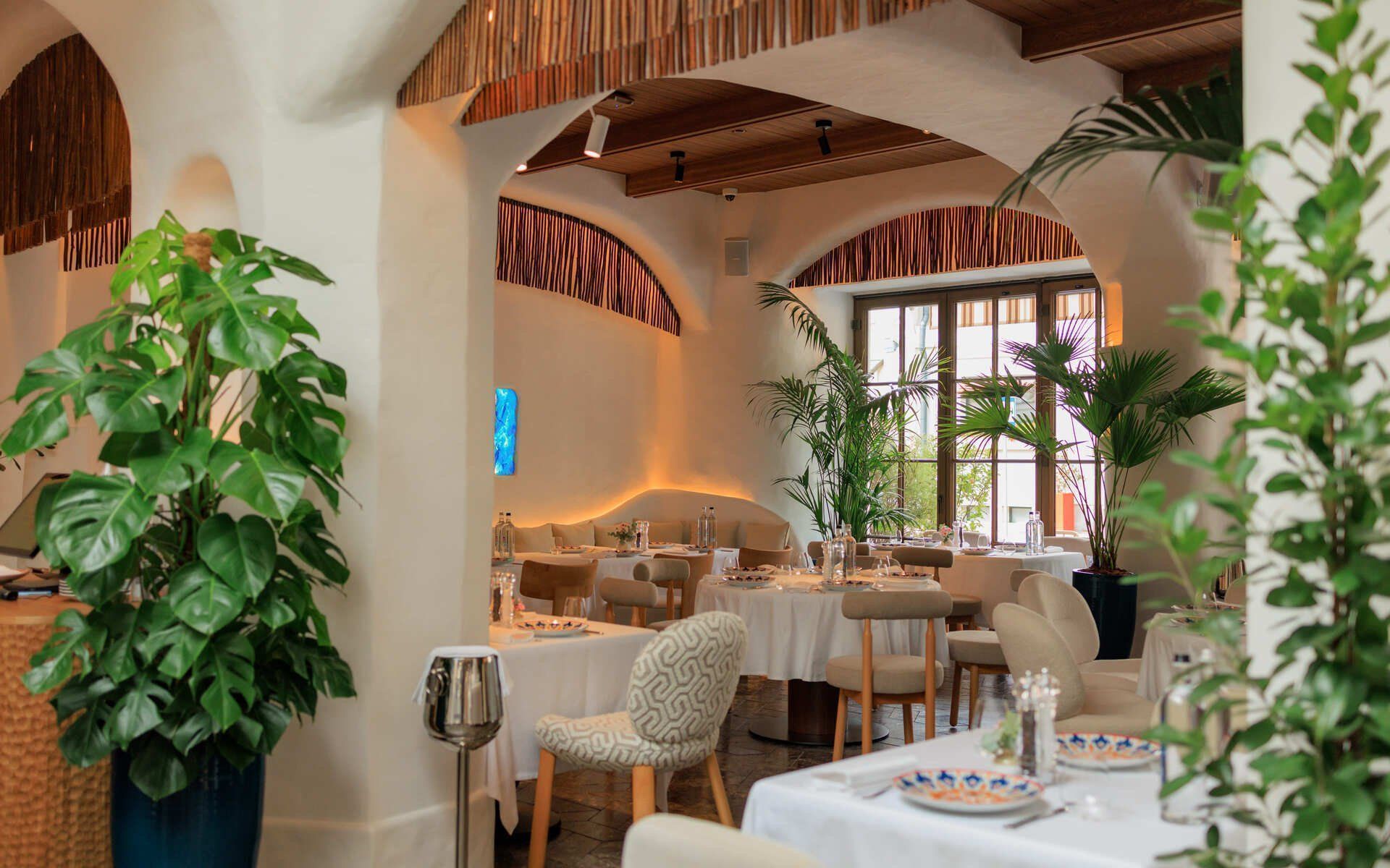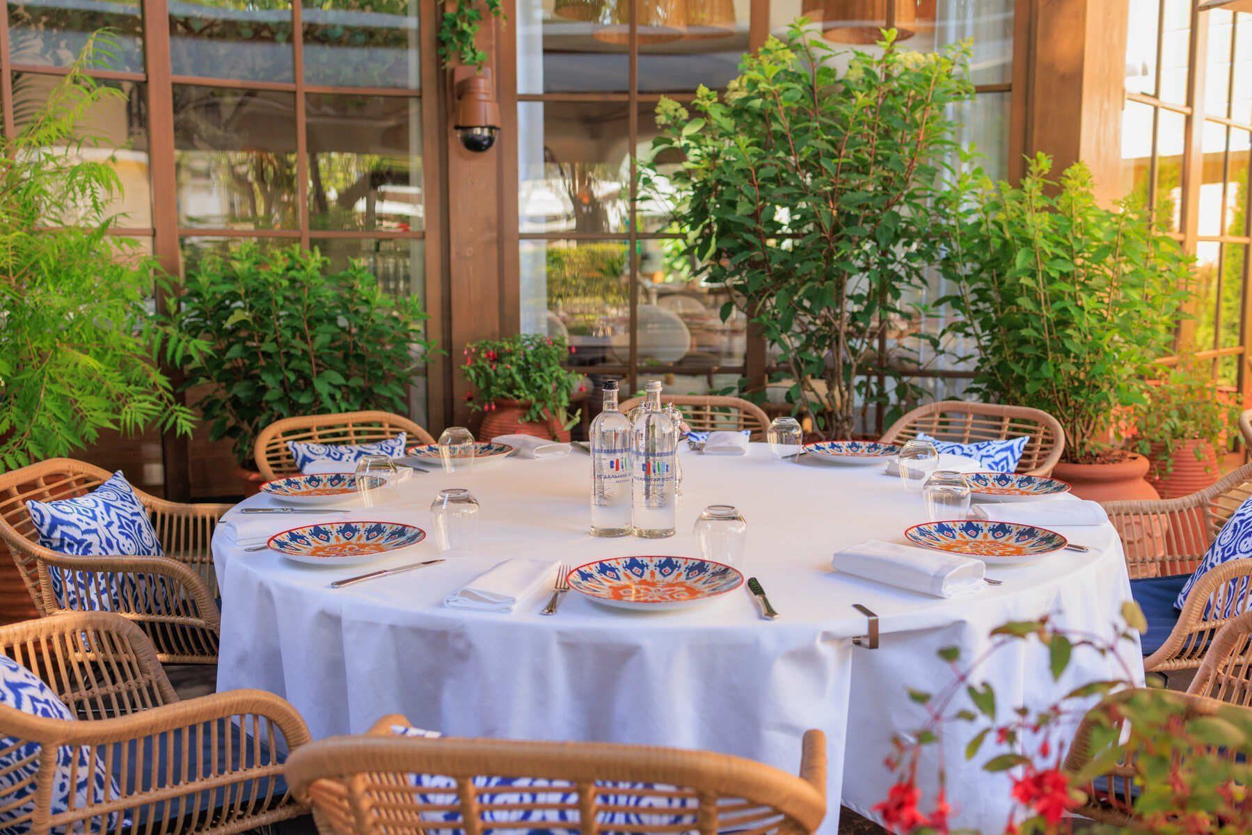Интерьер «Недальнего Востока» выдержан в легкой средиземноморской эстетике: много света, теплые древесные фактуры и живые растения в больших напольных вазах, которые расставлены по всему залу. Декор поддерживает тему ремесла и путешествий: на полках стоят глиняные кувшины, а зона открытой кухни оформлена узорами в лазурной гамме. Печь визуально отделена вставкой из бирюзового стекла, а столы оформлены белыми скатертями и расписной посудой. Посадка рассчитана на долгие встречи: светлые мягкие кресла и диваны с подушками создают расслабленное, неспешное настроение. В теплый сезон открывается веранда с плетеной мебелью для ужинов на свежем воздухе.