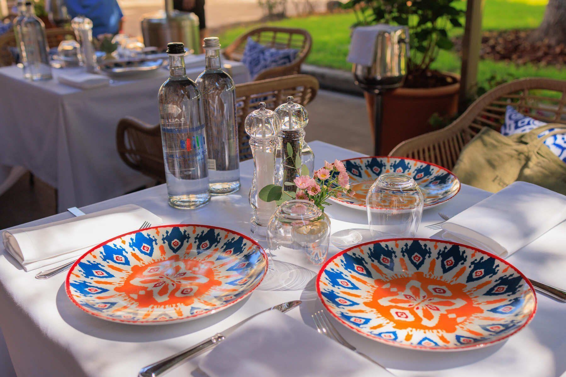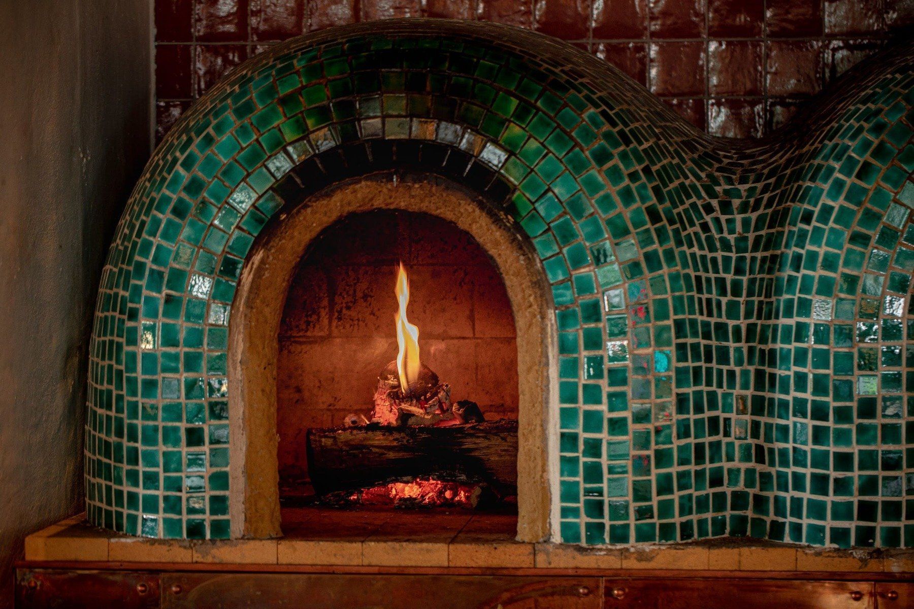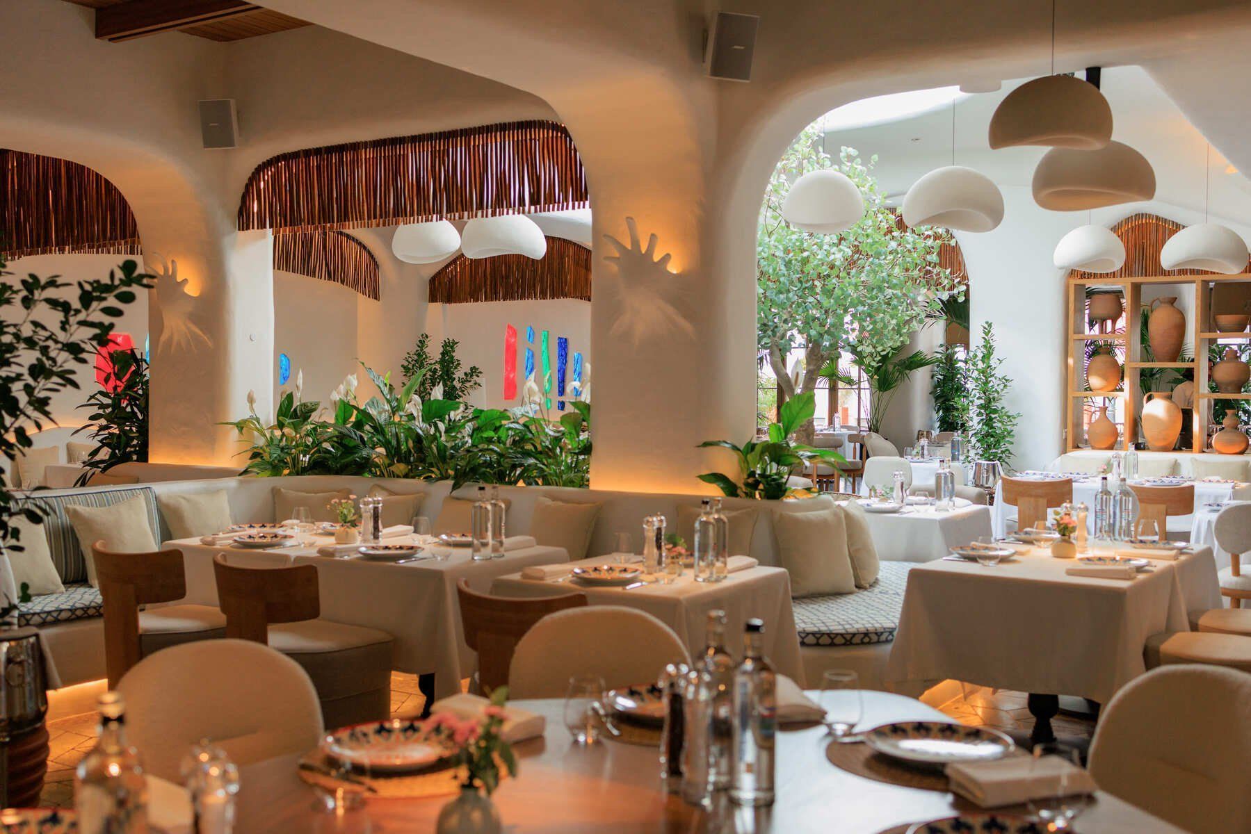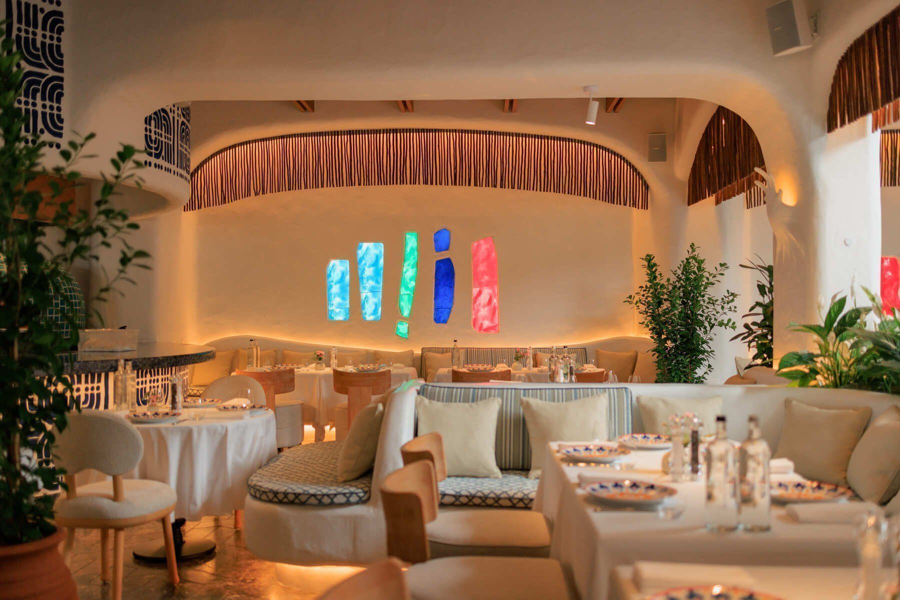 Интерьер «Недальнего Востока» выдержан в легкой средиземноморской эстетике: много света, теплые древесные фактуры и живые растения в больших напольных вазах, которые расставлены по всему залу. Декор поддерживает тему ремесла и путешествий: на полках стоят глиняные кувшины, а зона открытой кухни оформлена узорами в лазурной гамме. Печь визуально отделена вставкой из бирюзового стекла, а столы оформлены белыми скатертями и расписной посудой. Посадка рассчитана на долгие встречи: светлые мягкие кресла и диваны с подушками создают расслабленное, неспешное настроение. В теплый сезон открывается веранда с плетеной мебелью для ужинов на свежем воздухе.