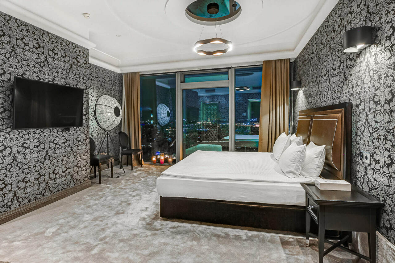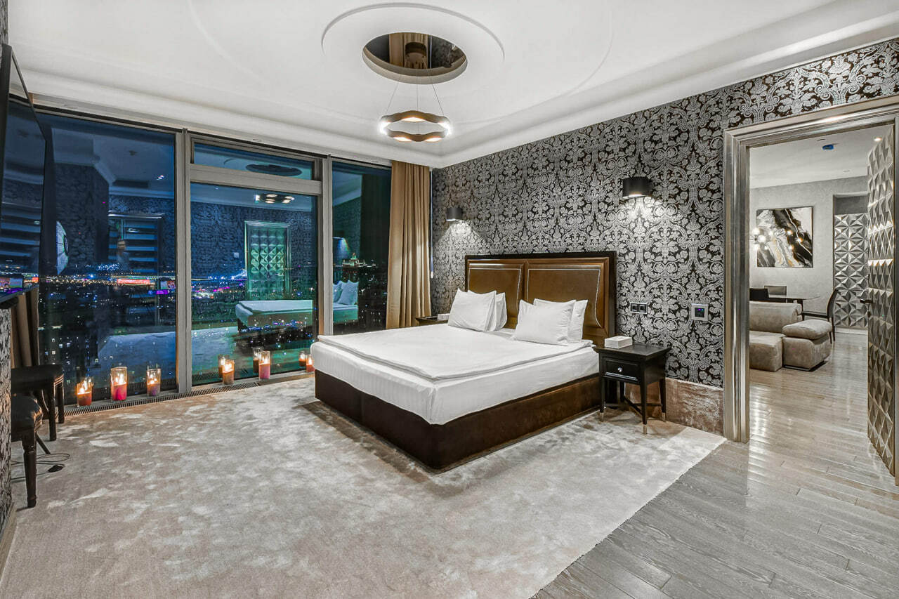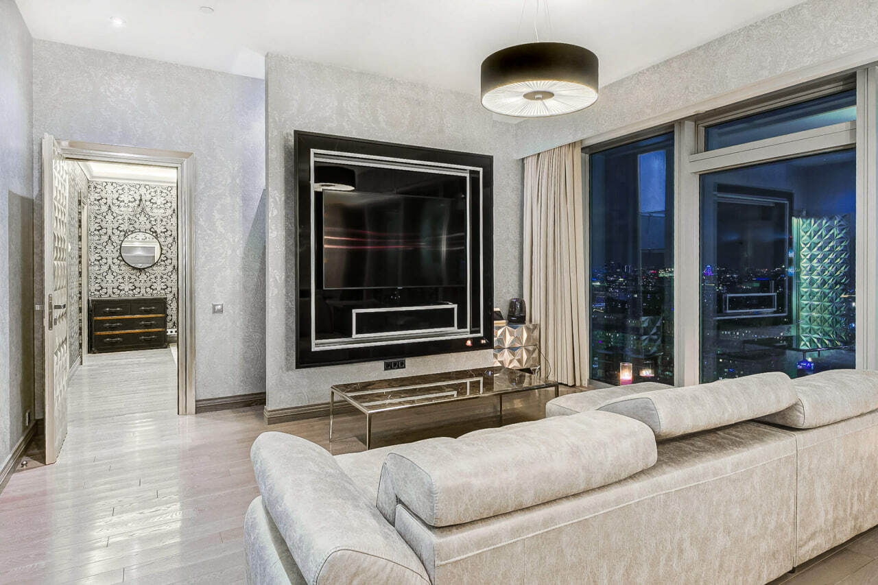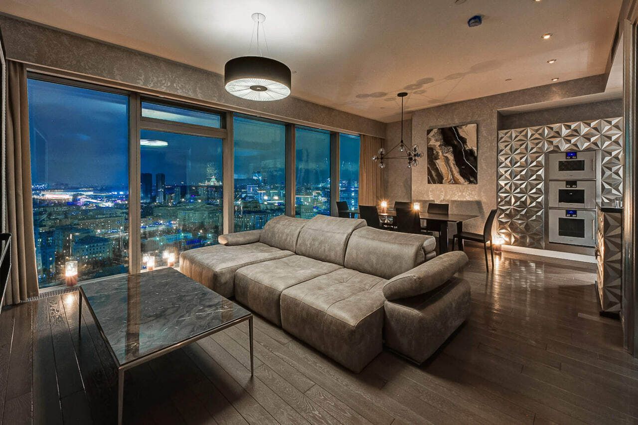 На 25-м этаже башни «Санкт-Петербург» комплекса Москва-Сити расположены эксклюзивные апартаменты с одной спальней и площадью в 105 квадратных метров. Интерьер выполнен по индивидуальному дизайнерскому проекту.