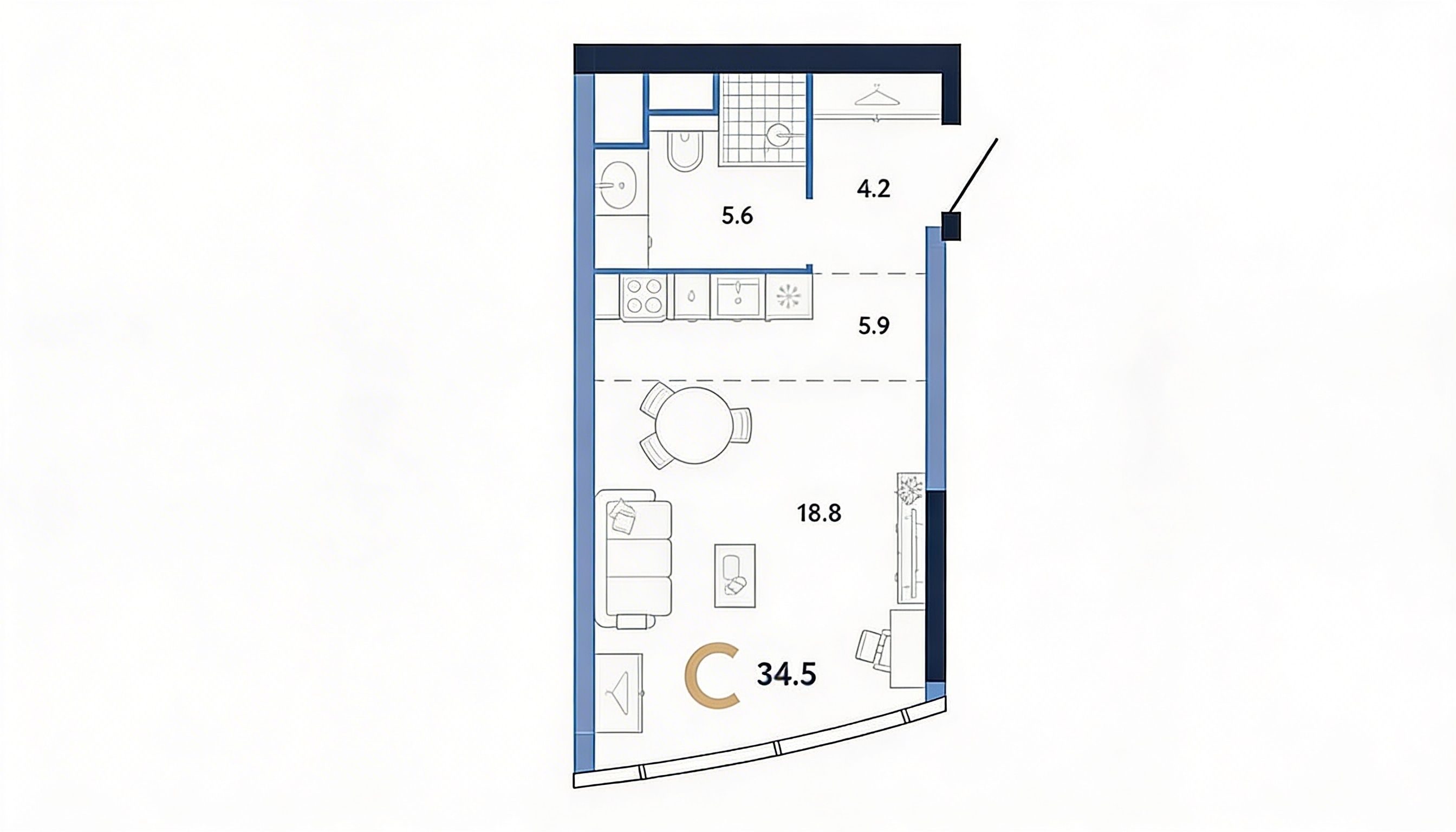 - Площадь: 34,5 м²