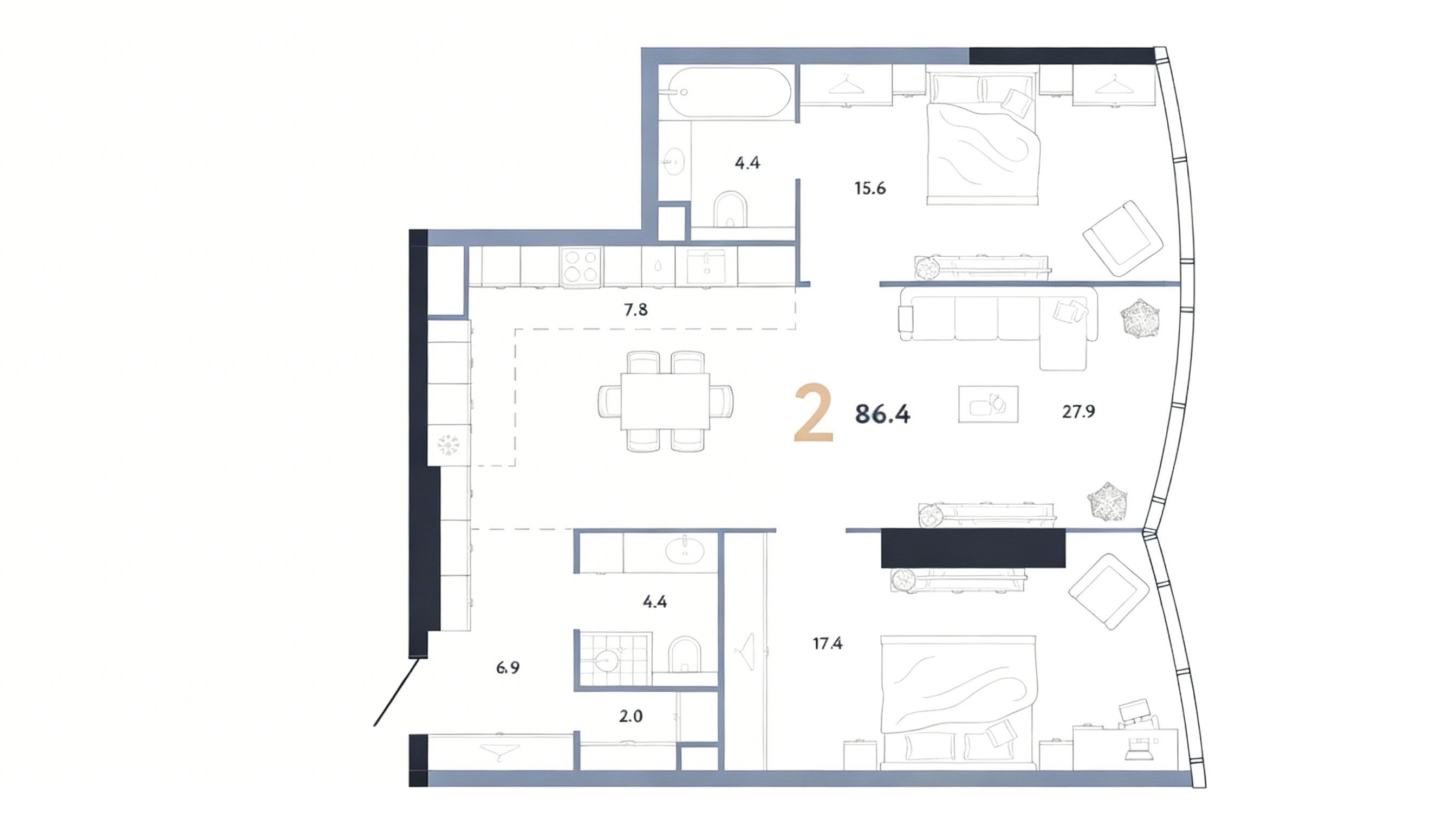 Площадь 86,4 m2 позволяет организовать пространство более свободно и функционально, чем в стандартном городском формате. Внутренняя структура квартиры подходит для комфортного проживания в ритме большого города, когда важны не только эстетика интерьера, но и удобство ежедневного использования. Две ванные комнаты делают планировку практичной для семьи, пары или собственников, которые часто принимают гостей и ценят дополнительный уровень удобства в бытовых сценариях.