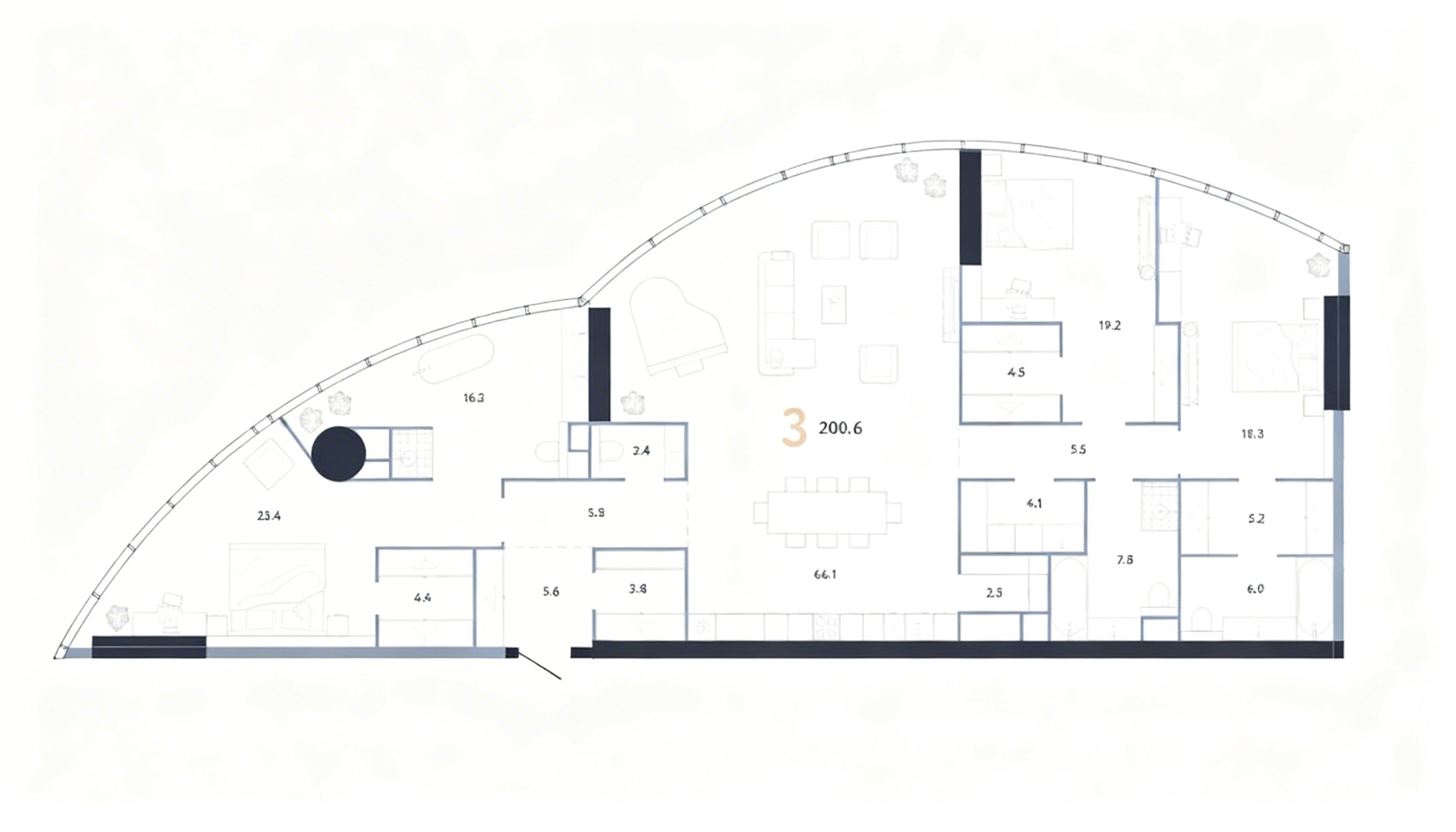 Отсутствие отделки в данном случае является преимуществом, поскольку будущий интерьер можно выстроить с нуля, с учетом личных предпочтений по материалам, инженерии, световым сценариям и зонированию. Площадь 200,6 м2 дает достаточно свободы для создания выразительной общей зоны, нескольких приватных помещений и полноценных вспомогательных функций без ощущения ограниченности. Это квартира, в которой можно не подстраиваться под готовое решение, а формировать пространство под себя.