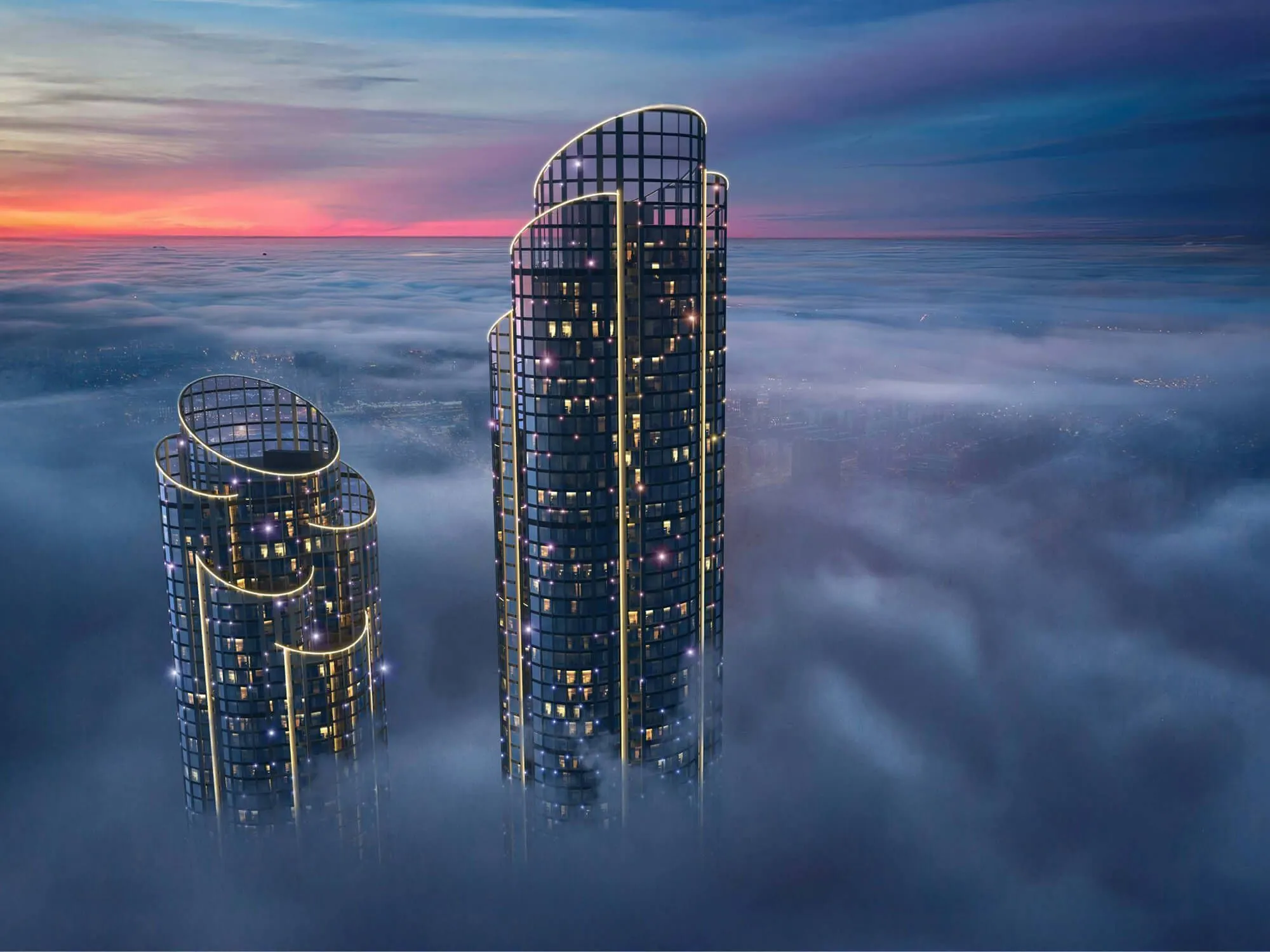 AURUS Residences - две жилые башни высотой до 395 м в новом кластере «Сити-2» рядом с Москва-Сити. 1 774 квартиры, бионическая архитектура APEX, парк на стилобате и премиальная инфраструктура. Завершение - 2031 год.