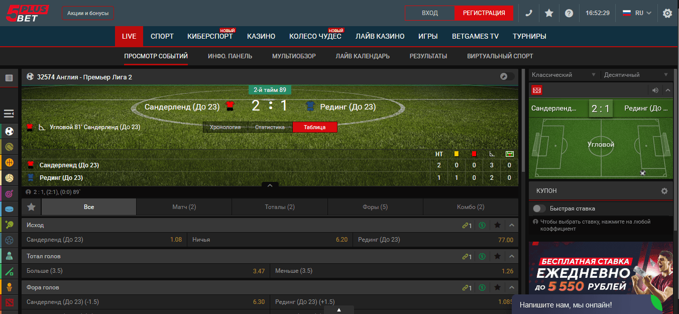 Линия у 5plusbet охватывает как популярные турниры, так и менее рейтинговые соревнования. В прематче особенно выделяется футбол: в топ-встречах доступно около 250 маркетов, в более скромных лигах — порядка 150. Роспись широкая: большие амплитуды тоталов и гандикапов, комбо-исходы, дополнительные статистические варианты — всё это позволяет гибко выстраивать стратегию игрока и подбирать ставки под свой риск-профиль. Купоны в прематче оформляются моментально.