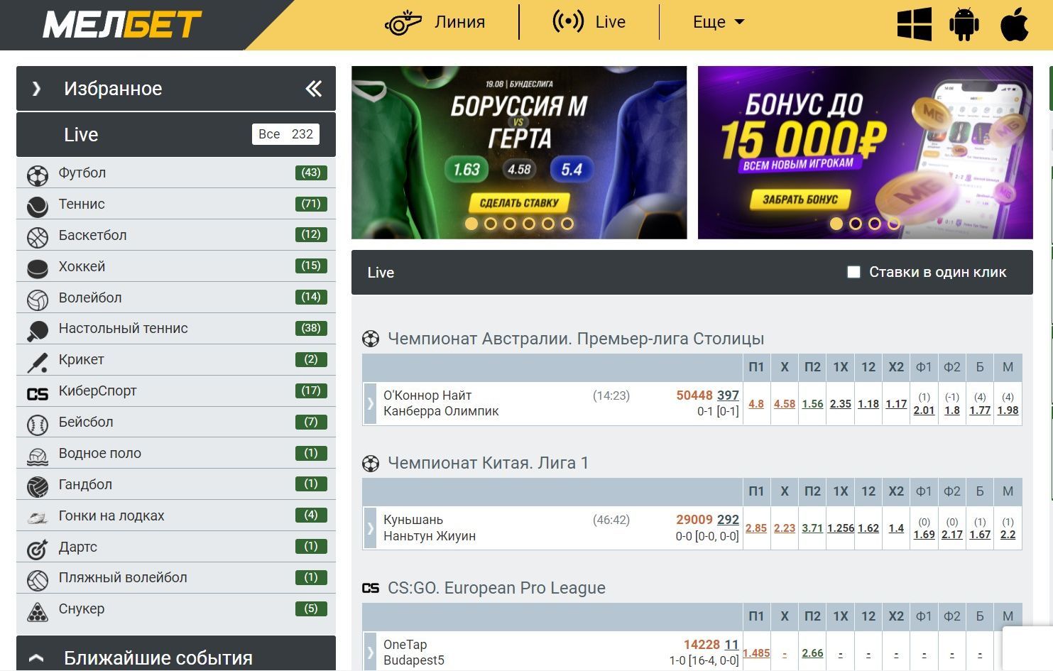 В арсенале Melbet букмекерская контора представлено более 30 классических спортивных дисциплин - от футбола, тенниса и хоккея до флорбола и крикета. Любителей виртуальных соревнований порадует внушительный раздел киберспорта: БК Мелбет предлагает ставки более чем на 10 популярных кибердисциплин, включая Dota 2, CS:GO и League of Legends, с подробной статистикой и Live‑режимами.