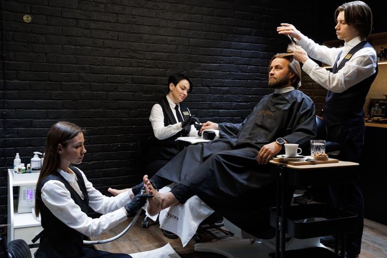 Меню объединяет ключевые услуги классической цирюльни и современного grooming: мужские стрижки, оформление и моделирование бороды, бритьё опасной бритвой (включая «королевское»), камуфляж седины, укладки. Дополняют предложение уходовые сервисы — мужской маникюр и педикюр. Для тех, кто ценит время, доступен формат «в шесть рук»: стрижка, маникюр и педикюр выполняются параллельно в отдельном VIP-кабинете. В салоне предусмотрены несколько приватных комнат, отдельная spa-зона и барная карта — от чая до классических «мужских» напитков.
