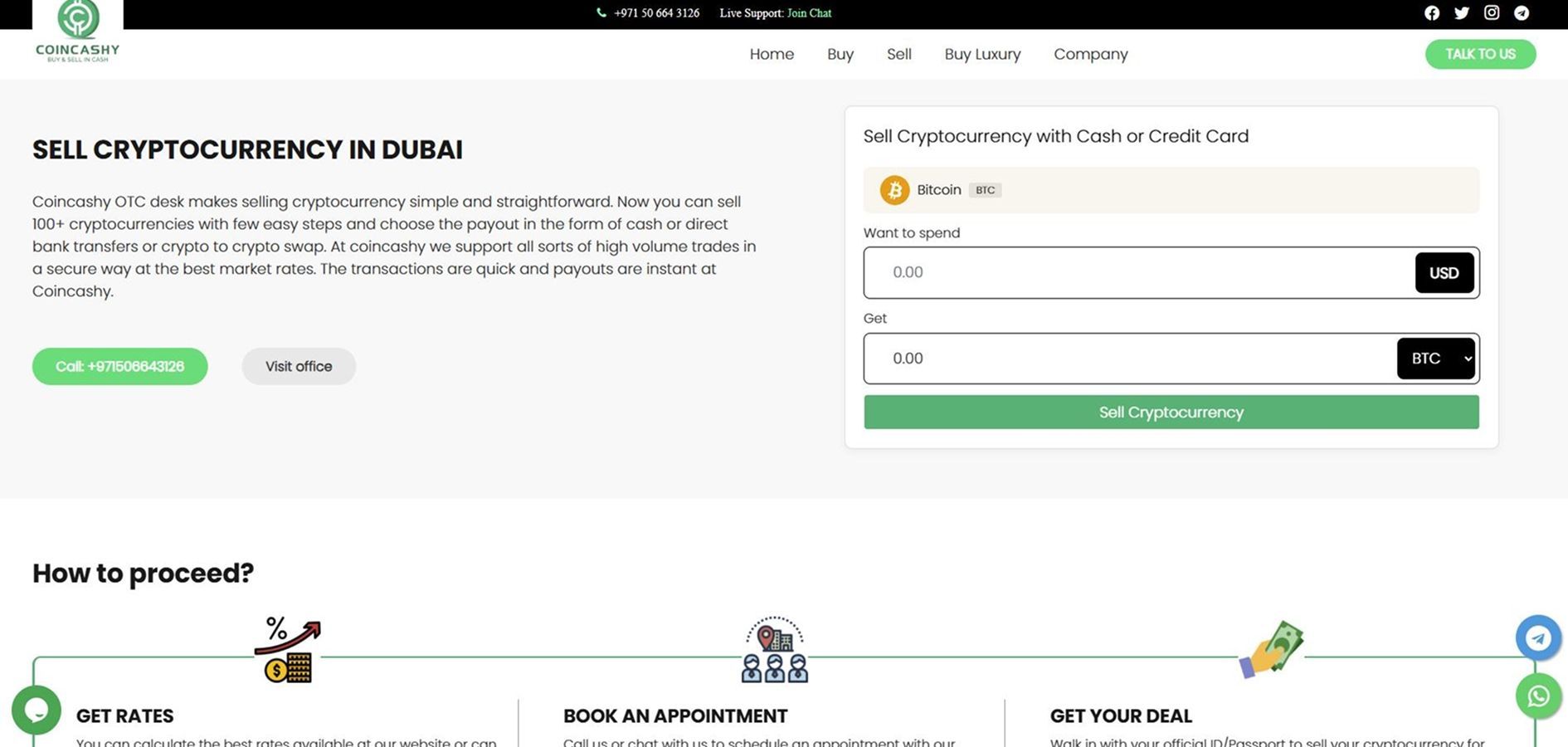 Coincashy 专注于迪拜市场,通过线下模式运营,在办公室接待客户。主要工作流程包括预约、确认细节以及客户亲临现场完成交易。这种模式适用于现金交易以及预先确定条件的兑换业务。