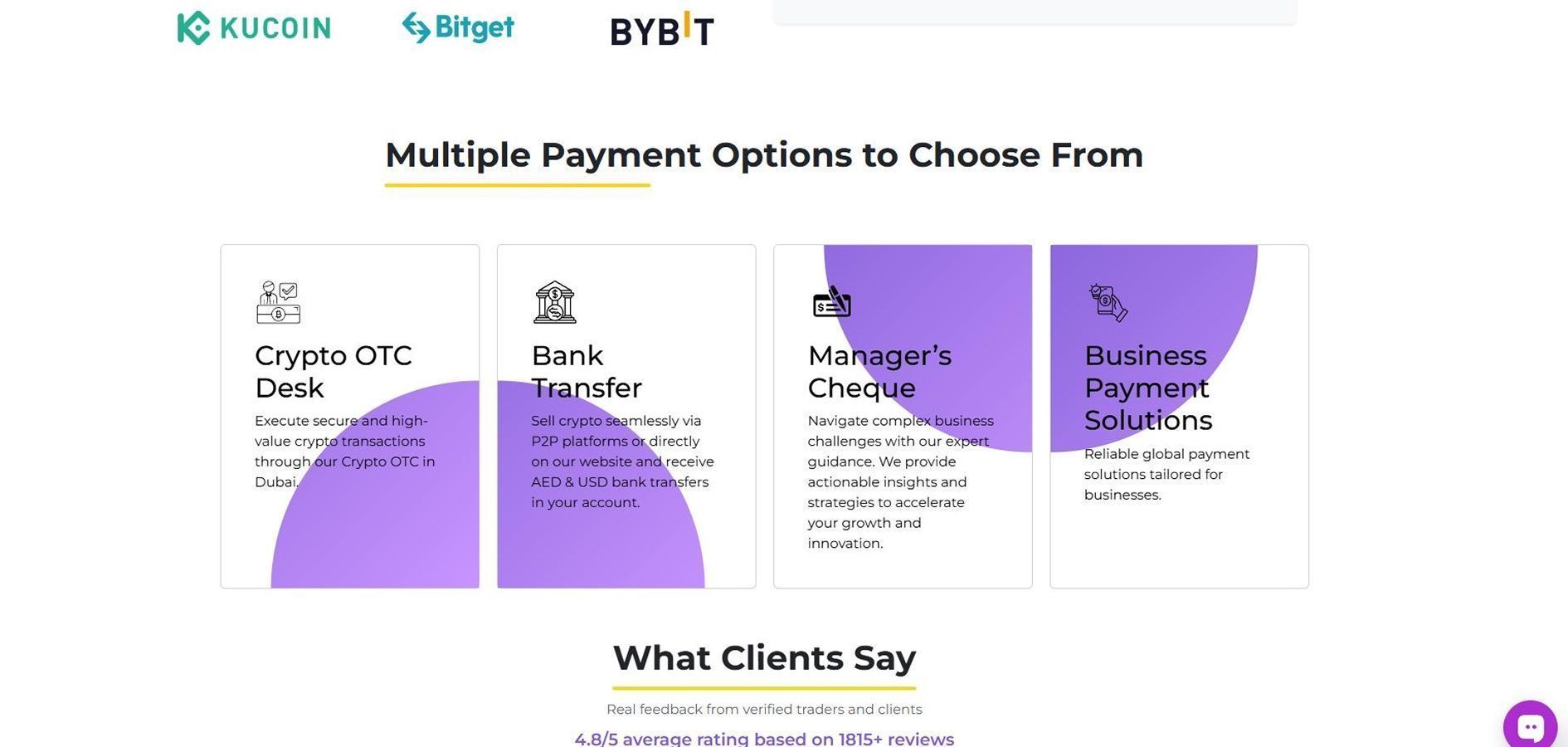 该服务主要用于在迪拜使用法币买卖加密货币。重点在于场外交易、支持迪拉姆(AED)结算,并以客户便捷的方式进行交易,包括大额交易。