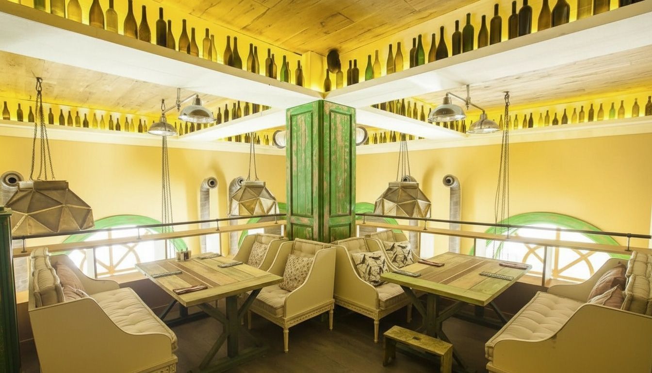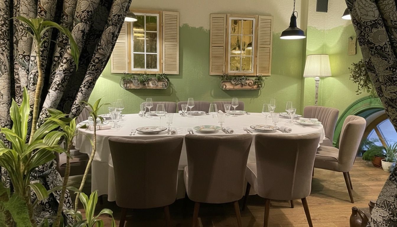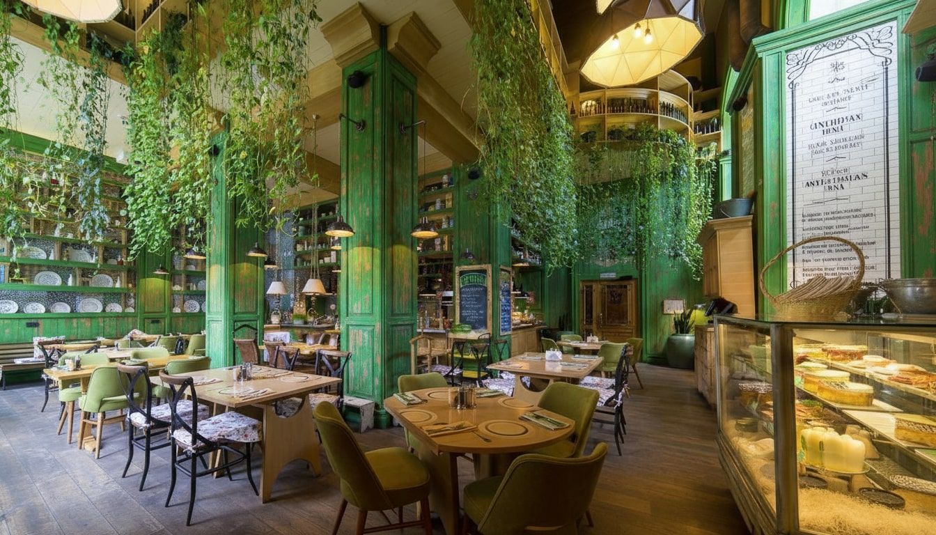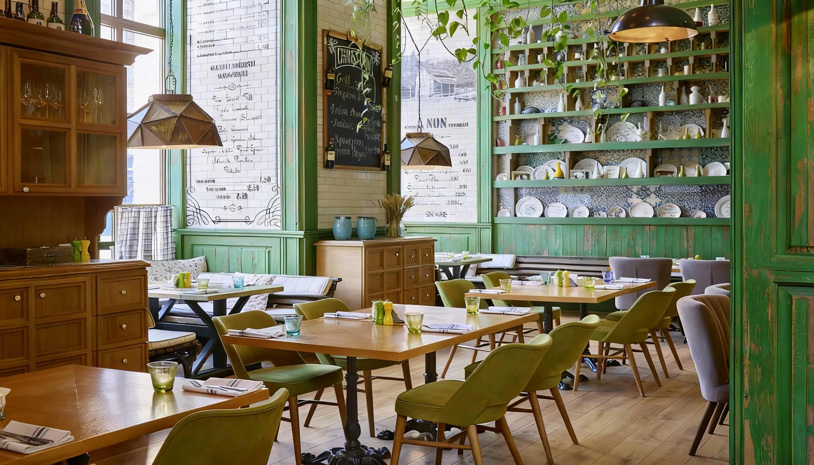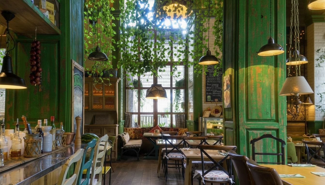 室内采用柔和的绿色调,营造出室内常驻“春意”的氛围。鲜活的绿植、垂坠的藤蔓、盆栽中的精致组合,以及从拱形窗户透入的自然光,共同构筑出一种无需过度装饰的温馨感。 开放式厨房为空间注入活力:菜肴的香气融入整体氛围,增强了宾客对现场体验的沉浸感。因此,这个空间不再被视为传统的餐厅,而是一个氛围明快、舒适宜人的美食环境。