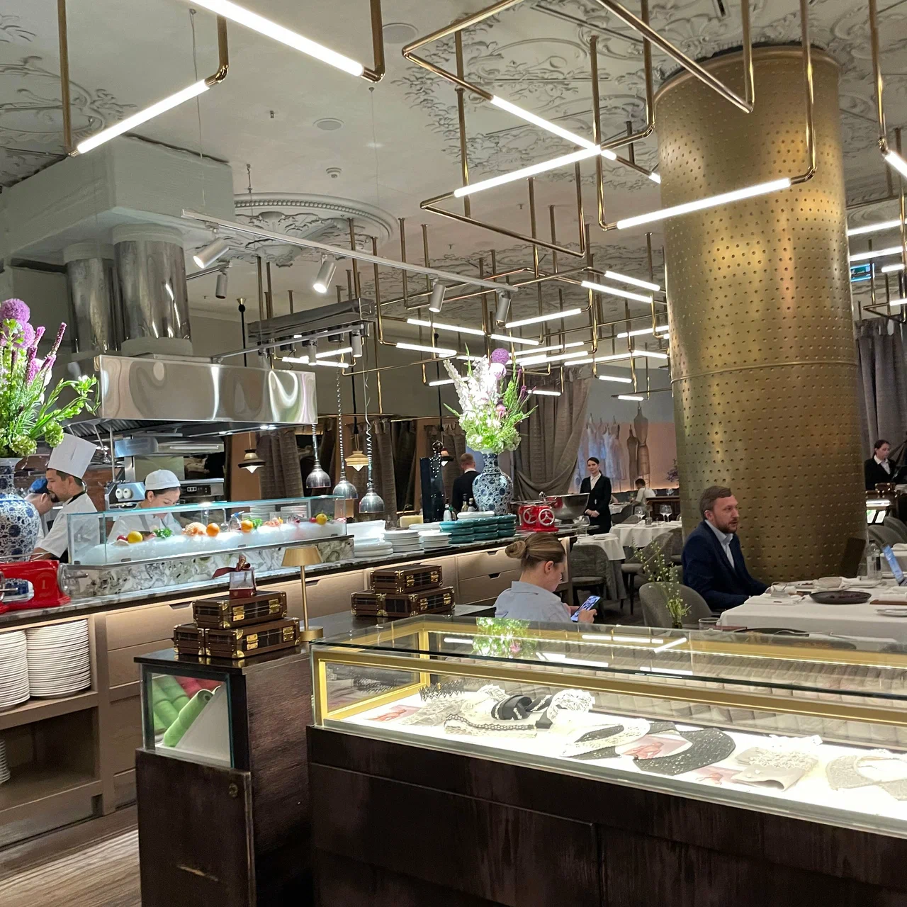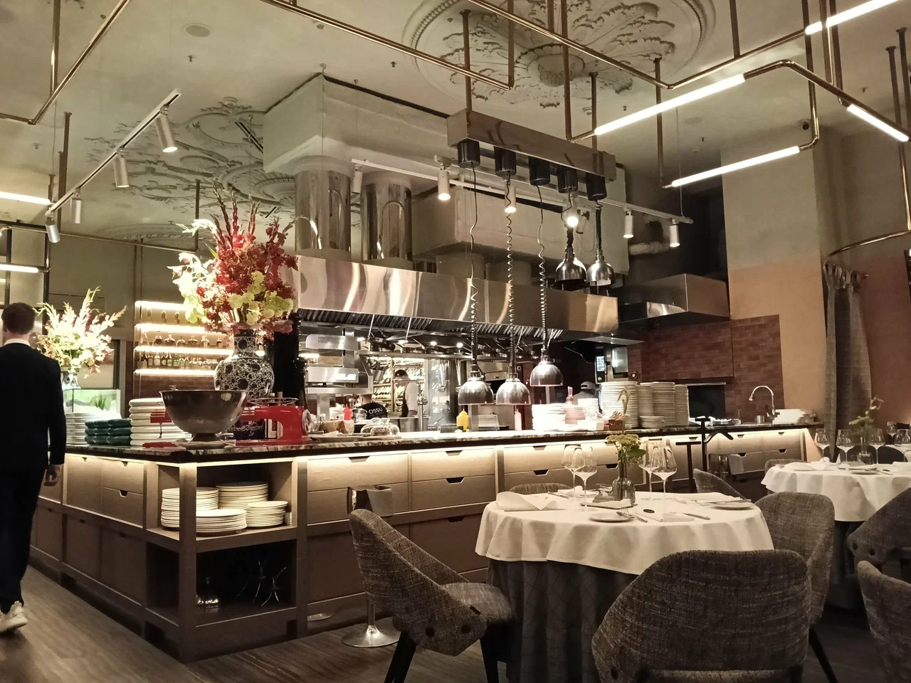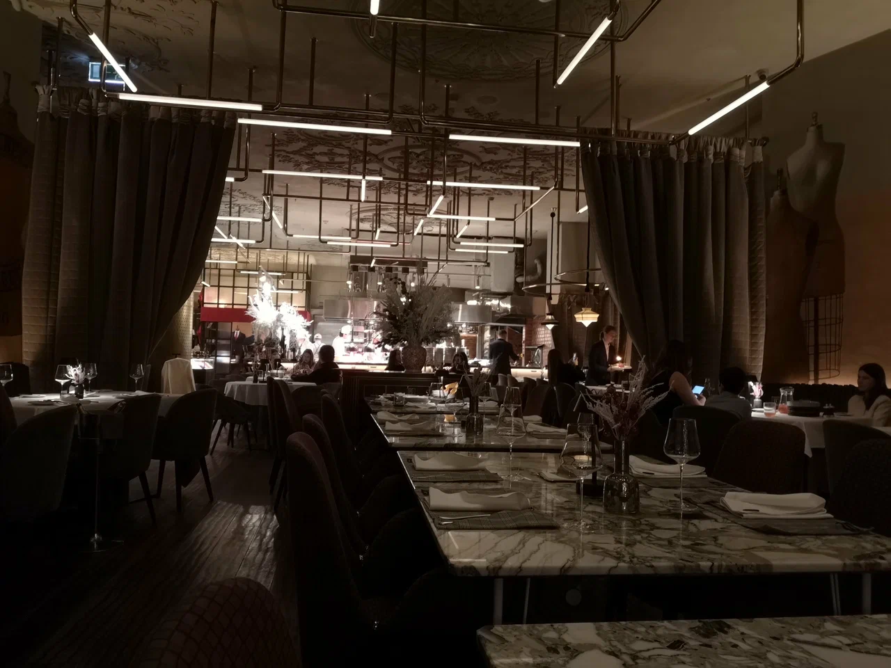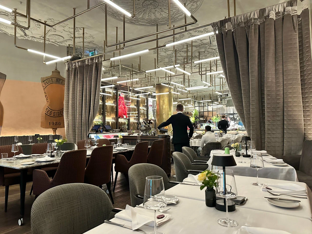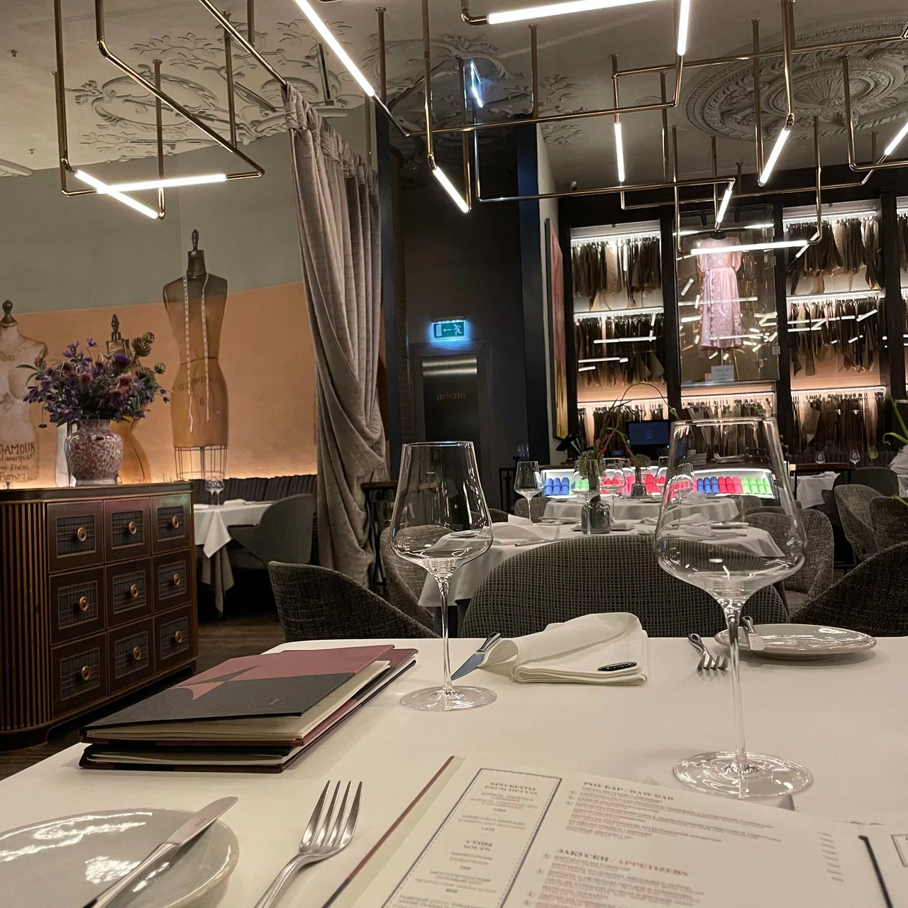 Sartoria Lamberti 位于莫斯科市中心,坐落在 The Carlton, Moscow 酒店一层(Tverskaya 街 3 号)。餐厅名称源自意大利语 sartoria,意为裁缝工坊,这一隐喻在空间细节中清晰可见:整体设计被构想为一个“美食工作室”,带有橱窗般的展示感,结合织物质感与精心布置的灯光。室内设计项目与 Yuna Megre 及 MEGRE INTERIORS 相关,因此空间中有不少设计亮点,但整体氛围依然克制而平静。座位安排适合交流,服务节奏平稳克制,如无需要,不会有多余讲解。