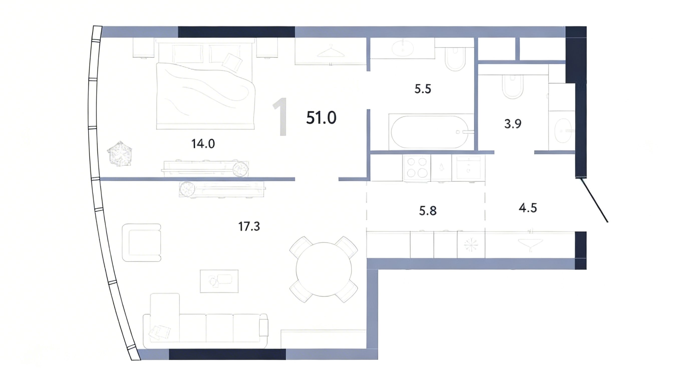 45层带来一种独特的空间体验。在这样的高度,公寓更具私密性,整体居住环境也显得更加安静、开阔。对于希望在保持城市中心位置优势的同时,又能与密集城市节奏保持一定距离的人来说,这种居住形式尤为具有吸引力。对于一居室而言,51 m2 的面积依然十分舒适,可以打造完整而协调的室内空间,而不会让人产生妥协或局促的感觉。