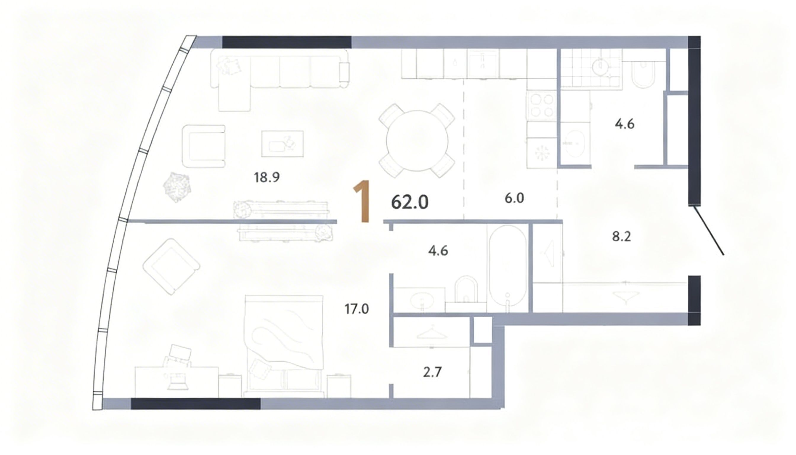 这套公寓的主要特点不仅在于其高楼层位置,还在于空间本身的布局结构。两间浴室让日常生活更加舒适,同时显著提升整体功能性。独立衣帽间能够更加合理地组织储物空间,减少主生活区对大型衣柜的依赖,使整体室内设计更加简洁、有序并在视觉上更加轻盈。对于一居室而言,这是非常重要的优势,使其在居住舒适度上接近更大面积的住宅布局。