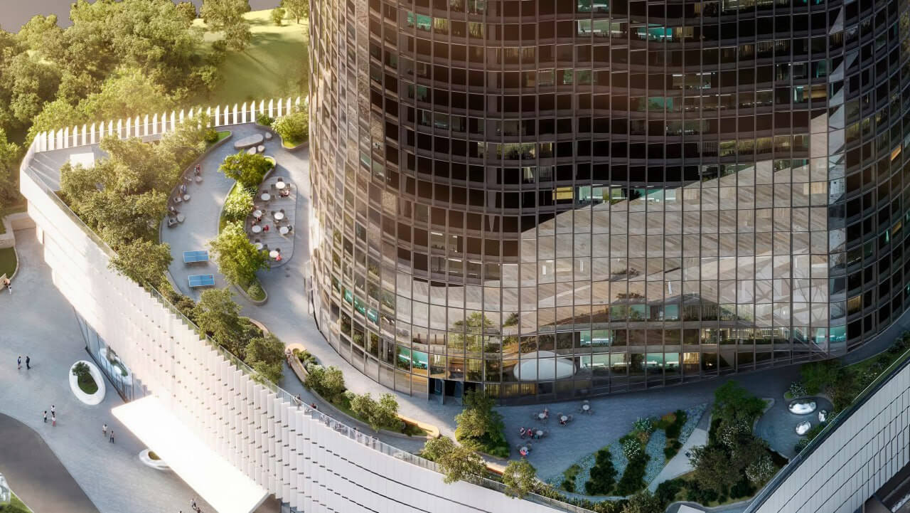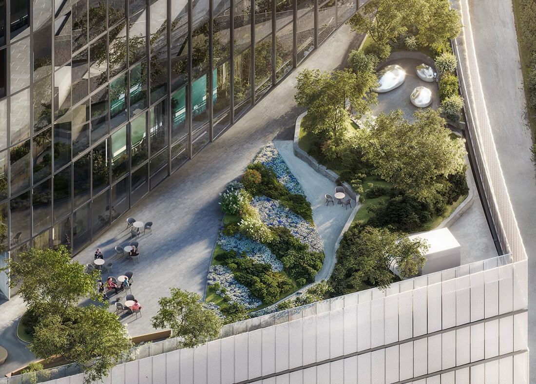 公共和商业空间。低层将设有餐厅、咖啡厅、商店、带游泳池的健身中心以及冬季花园。中央中庭将采用玻璃穹顶,引入自然光线,营造开阔感。基座将办公室与城市连接起来,提供会议、工作和休闲的空间。