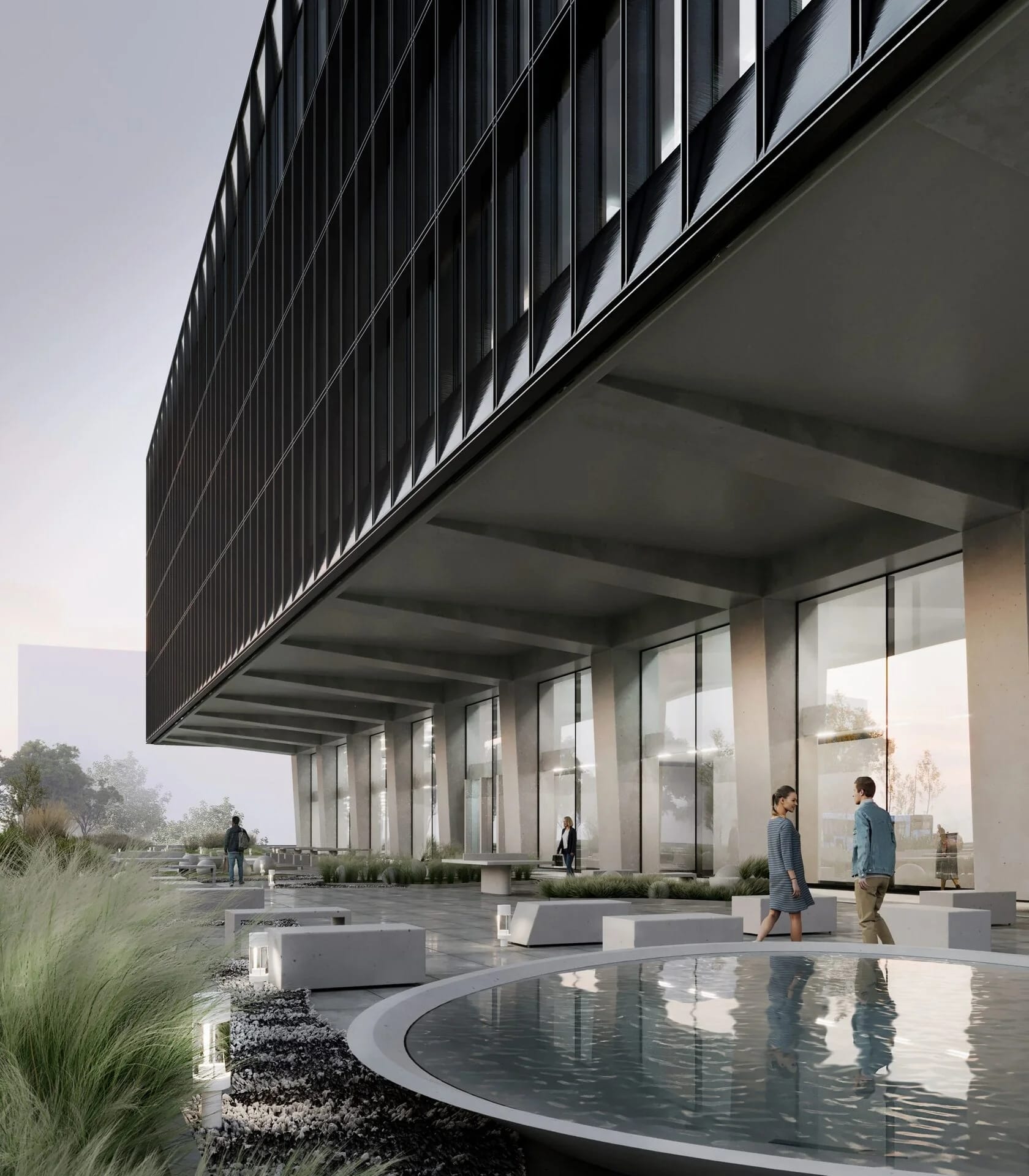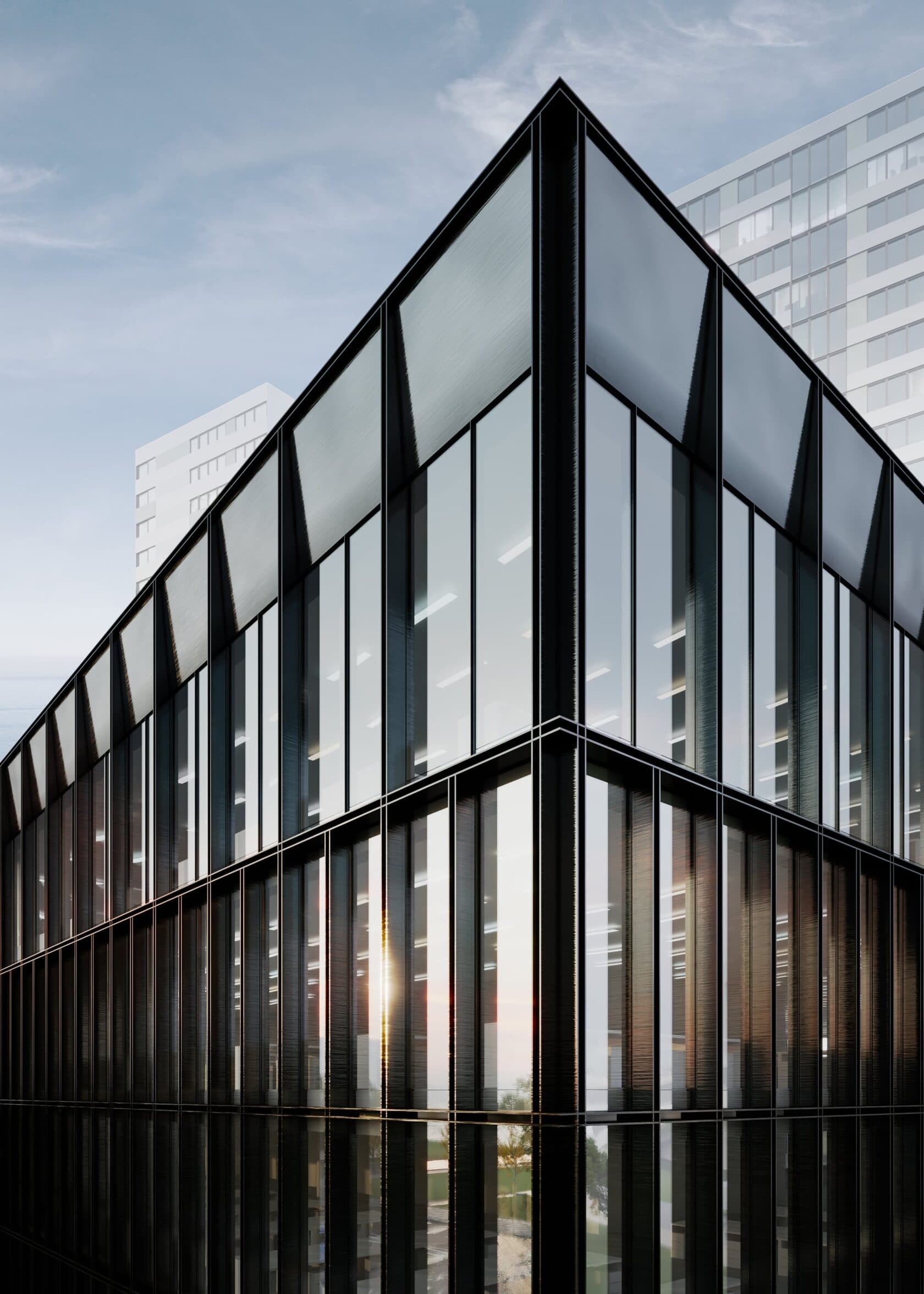 商务中心的外墙采用大尺寸深石墨色陶土板,致敬黑曜石。落地全景玻璃窗让自然光线倾泻而入,降低能耗,营造出视觉上的轻盈感。