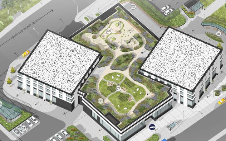 在可持续发展和环境责任的背景下,Cosmopolit 住宅区的开发商可以考虑在小区内采用绿色技术并打造本地绿地。例如,在建筑立面上安装绿色屋顶和垂直景观,不仅可以成为现代设计元素,还能成为改善环境的额外途径。这些措施将有助于弥补附近缺乏大型公园的不足,使小区内的生活更加舒适健康。