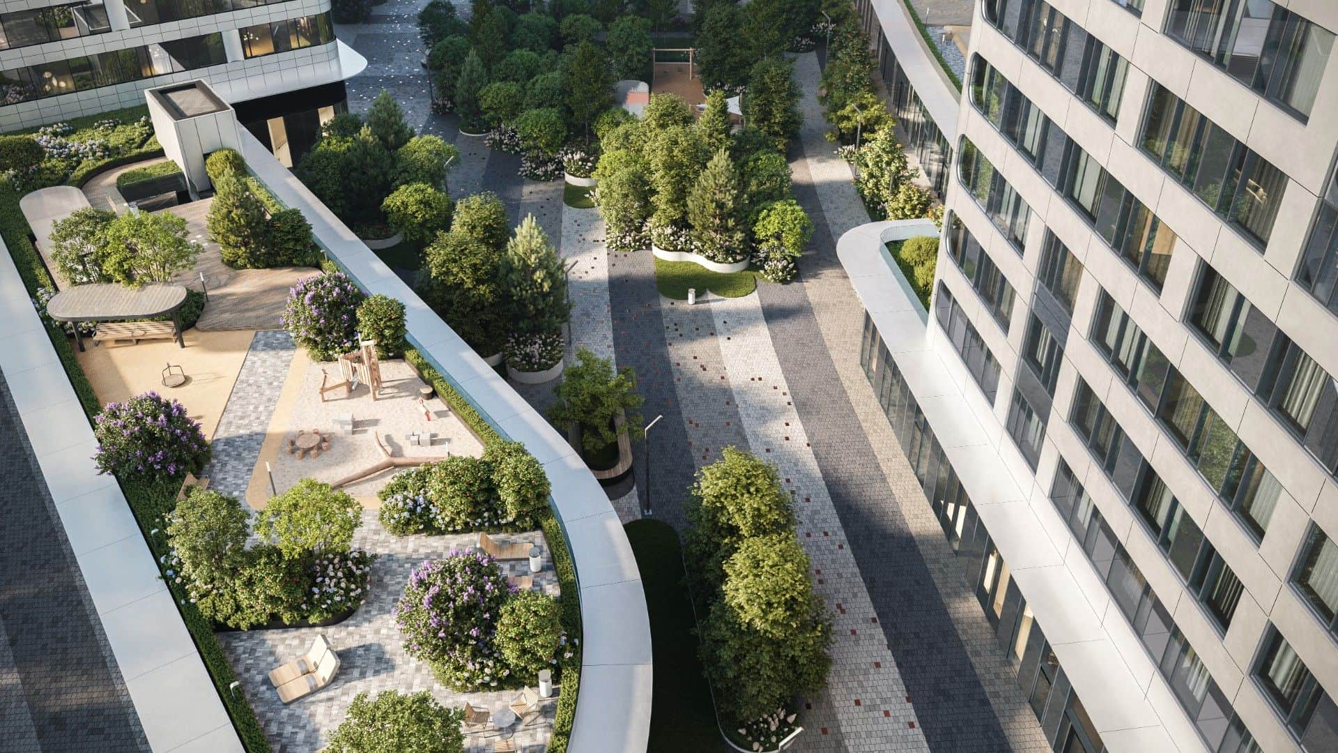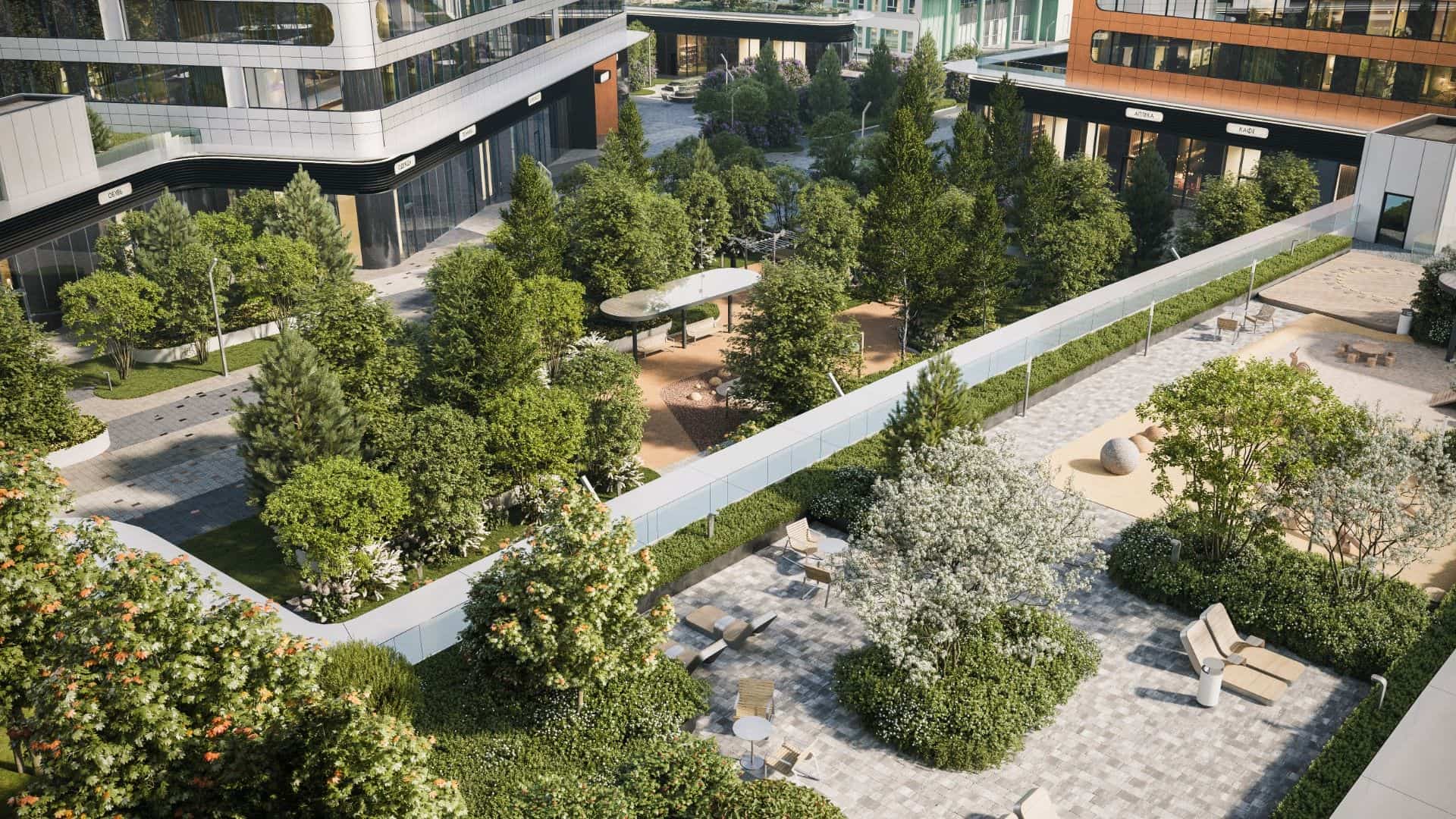 Внутренний парк площадью шесть гектаров, являющийся зелёным сердцем комплекса.