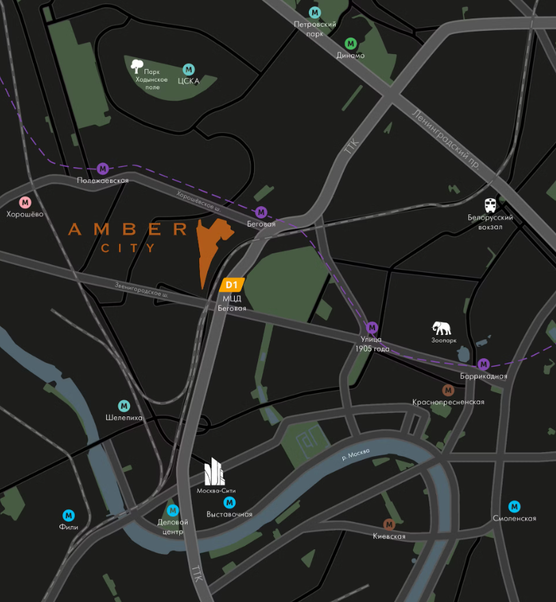 В нескольких шагах от ЖК расположены остановки автобусов на Хорошёвском шоссе, откуда можно удобно отправиться в такие живописные места, как Серебряный бор, или до других значимых объектов, таких как станция метро «Краснопресненская» и Чапаевский парк. Это делает жизнь в "Amber City" удобной и комфортной для тех, кто ценит быстроту и комфорт в перемещениях по городу.