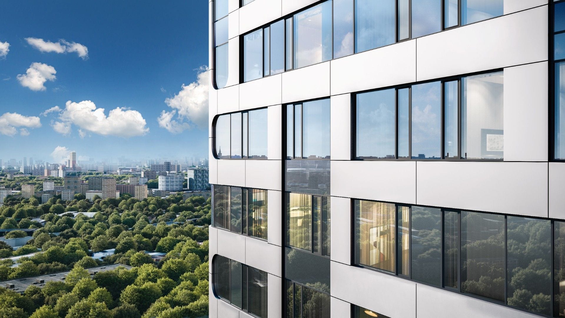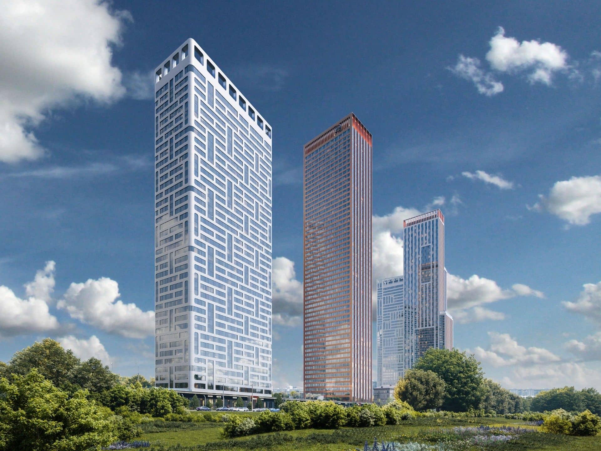 Жилой комплекс "Amber City" представляет собой архитектурный ансамбль из нескольких башен, которые гармонично соединены общей стилобатной основой. Это архитектурное решение позволяет максимально эффективно использовать пространство, предоставляя жителям не только комфортабельное жилье, но и великолепные виды на окружающий городской и природный ландшафт. Каждое здание спроектировано таким образом, чтобы обеспечить оптимальный обзор с каждого этажа, открывая панорамные виды на Москву.