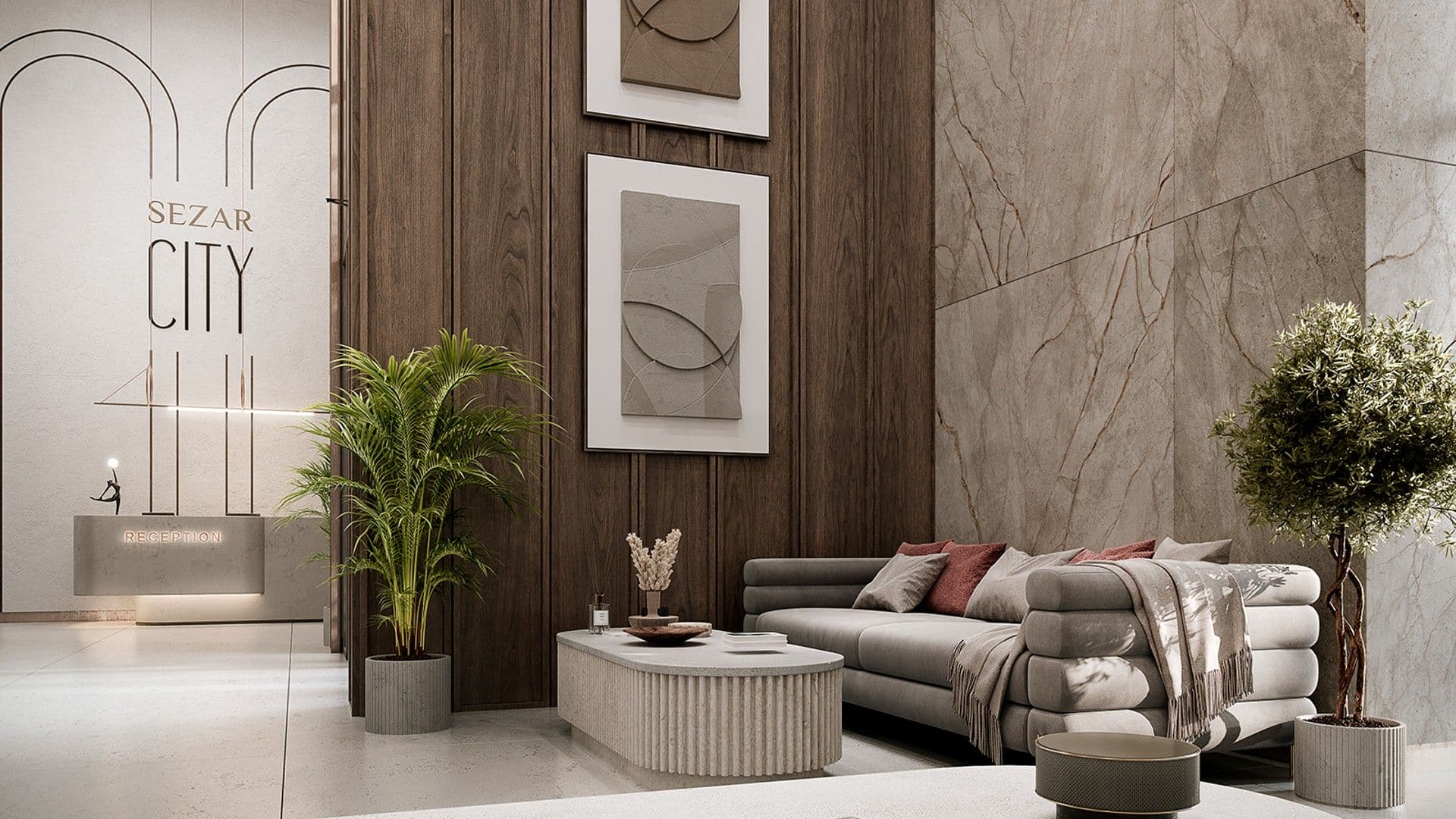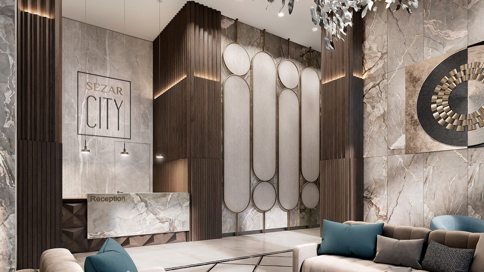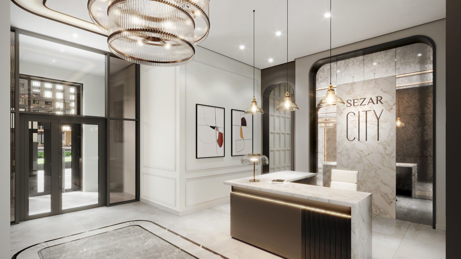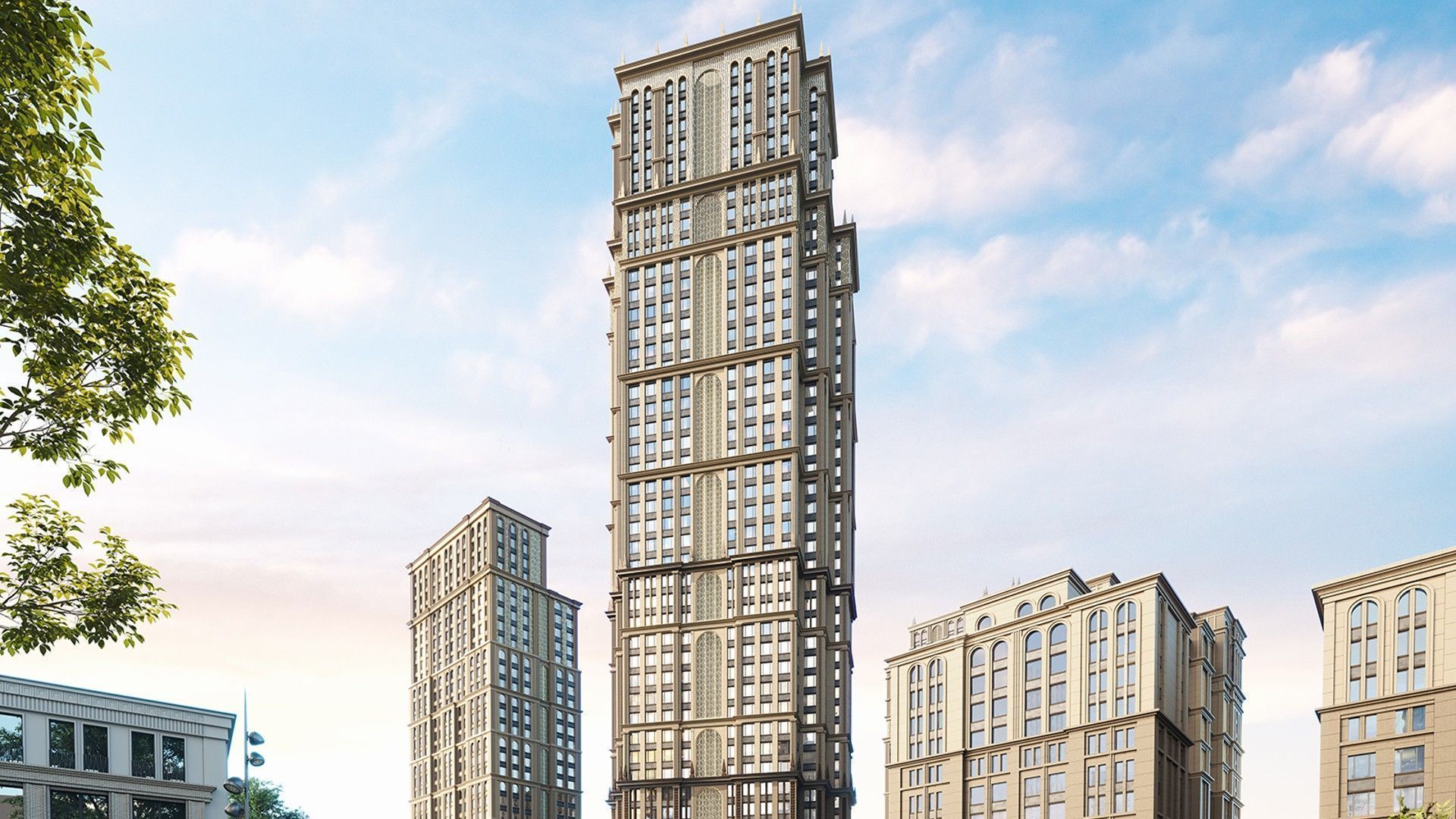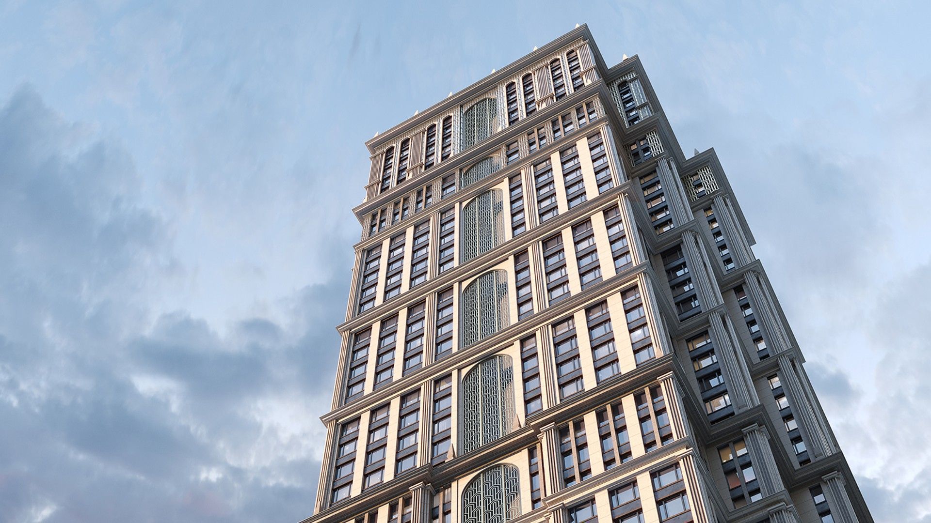 В основе проекта Sezar City лежат девять корпусов, чья этажность варьируется от 7 до 51 этажа, создавая выразительный городской силуэт. Архитекторы вдохновлялись изысканными мотивами ар-деко, что отражается в дизайне фасадов: шпили, арки и элегантные декоративные элементы придают комплексу утонченное обаяние. В тёмное время суток красота архитектурных деталей дополнительно подчеркивается мягкой художественной подсветкой, создающей атмосферу респектабельности и уюта.