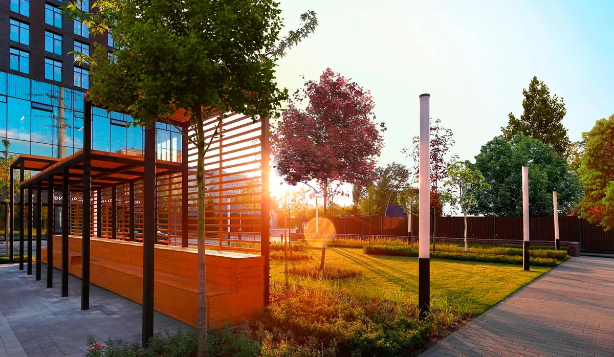 Ландшафтный парк. В центре комплекса — зеленая зона площадью около 2 га с аллеями, амфитеатром, фонтаном и зонами отдыха. Выполнен авторский ландшафтный дизайн с озеленением, скамейками и декоративным освещением.