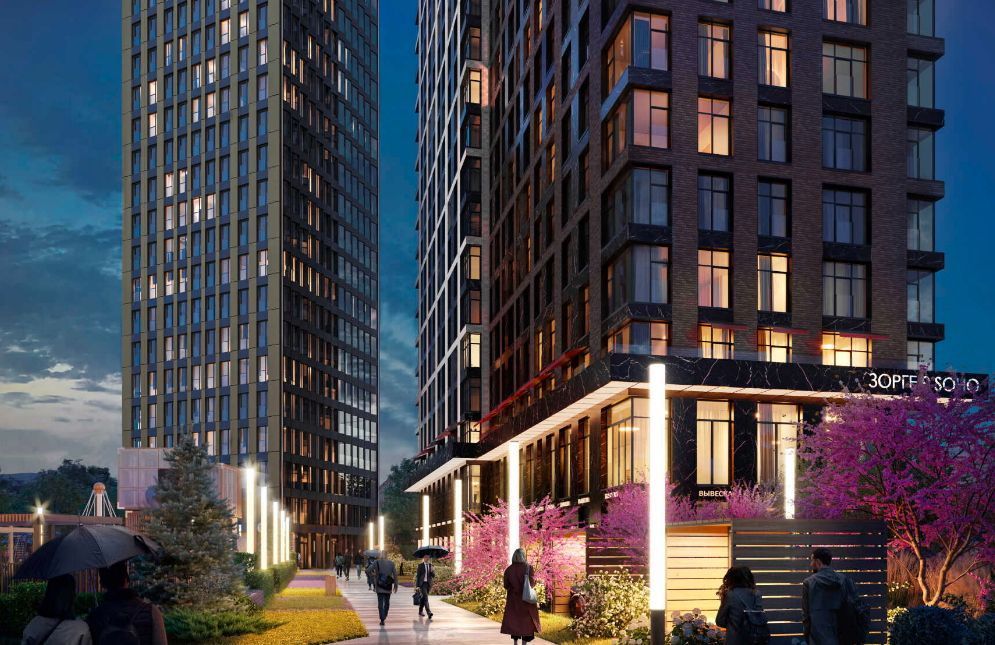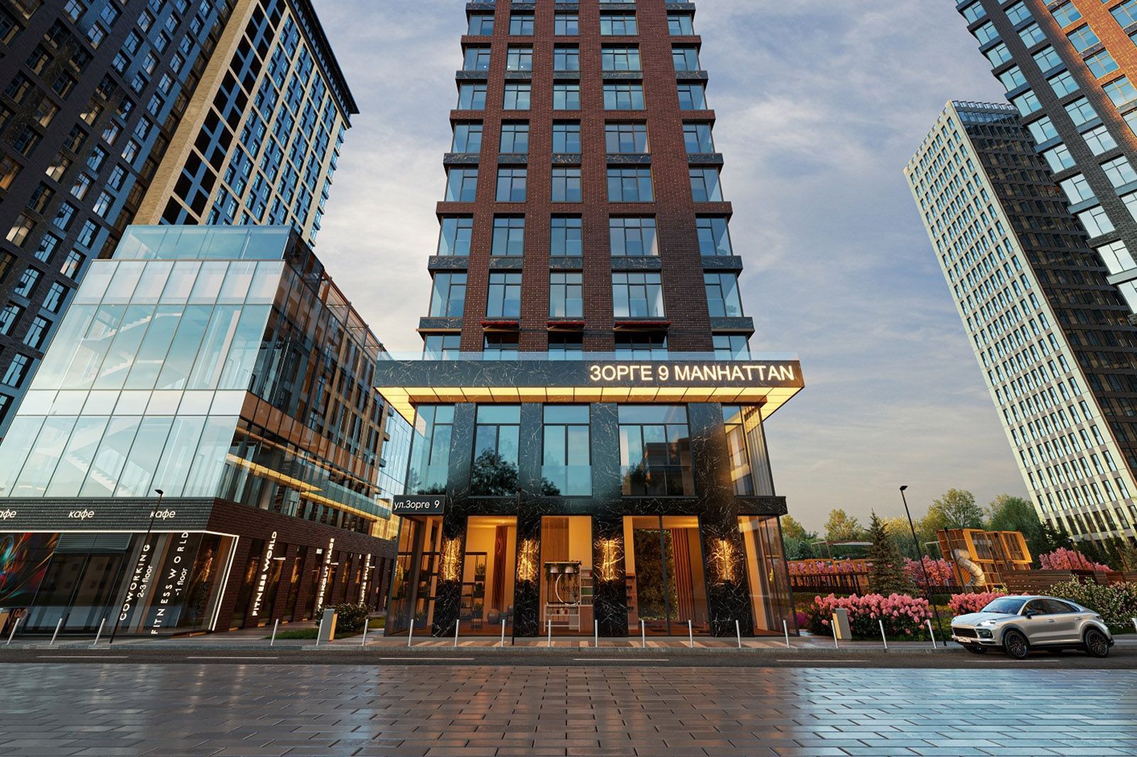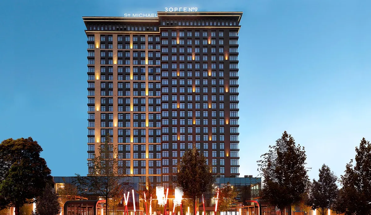 ЖК «Зорге 9» – современный квартал апартаментов бизнес-класса, расположенный на Ходынском поле Москвы и входящий в масштабный проект «Большой Сити». Комплекс включает три монолитных корпуса переменной этажности — от 17 до 21 этажа. Застройщик — девелоперская компания St Michael, известная своими архитектурными проектами высокого уровня. Архитектурная концепция выполнена в «нью-йоркском» стиле: фасады облицованы камнем под гранит и клинкерным кирпичом, акцент сделан на геометричность линий и панорамное остекление. Благодаря этому здания выглядят элегантно, строго и современно. Внутренние пространства также продуманы до мелочей: просторные гранд-лобби с потолками высотой до 6 метров оформлены с использованием натурального камня, дерева и дизайнерской мебели. Атмосфера напоминает лобби пятизвездочного отеля, что подчеркивает высокий статус жилого комплекса.