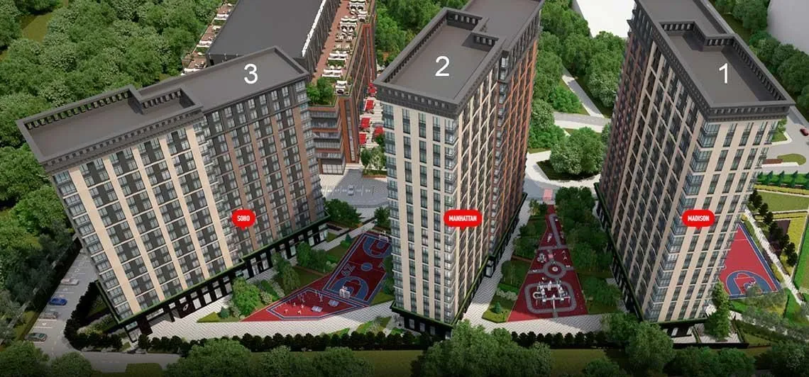 Архитектурная концепция ЖК «Зорге 9» подчёркивает современный облик: три корпуса названные в честь районов Нью-Йорка (Madison, Manhattan, Soho) оформлены выдержанными фасадами из камня и клинкера. Жесткие геометрические формы и крупное панорамное остекление придают дому солидный, но уютный облик. В каждом корпусе выполнен авторский дизайн общих зон: просторные элегантные лобби с дизайнерской мебелью, каминами и эксклюзивным освещением созданы по принципам отельной роскоши. Использование навесных вентилируемых фасадов и качественных материалов (алюминиевый оконный профиль, современные инженерные системы) обеспечивает повышенную долговечность и звукоизоляцию зданий. Во всех помещениях – высота потолков до 3,15 м (в пентхаусах до 4,2 м) и большие окна, которые создают ощущение простора и обеспечивают много дневного света.
